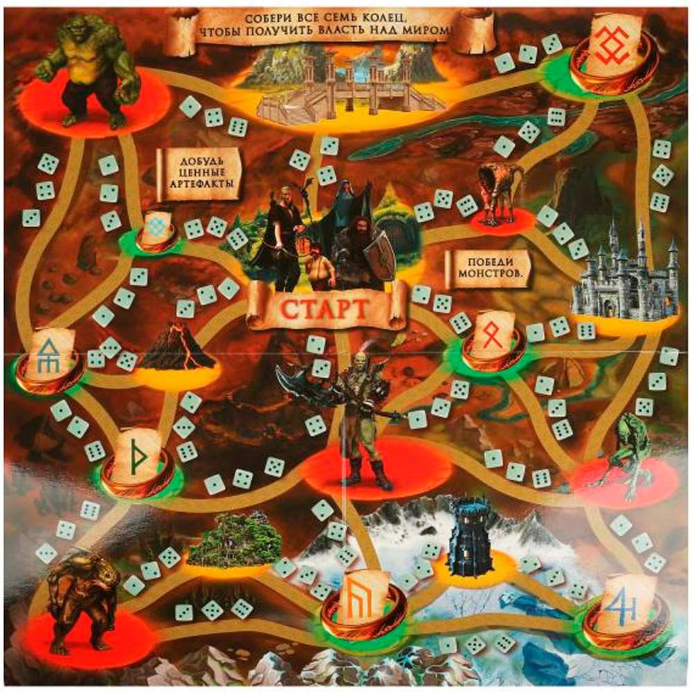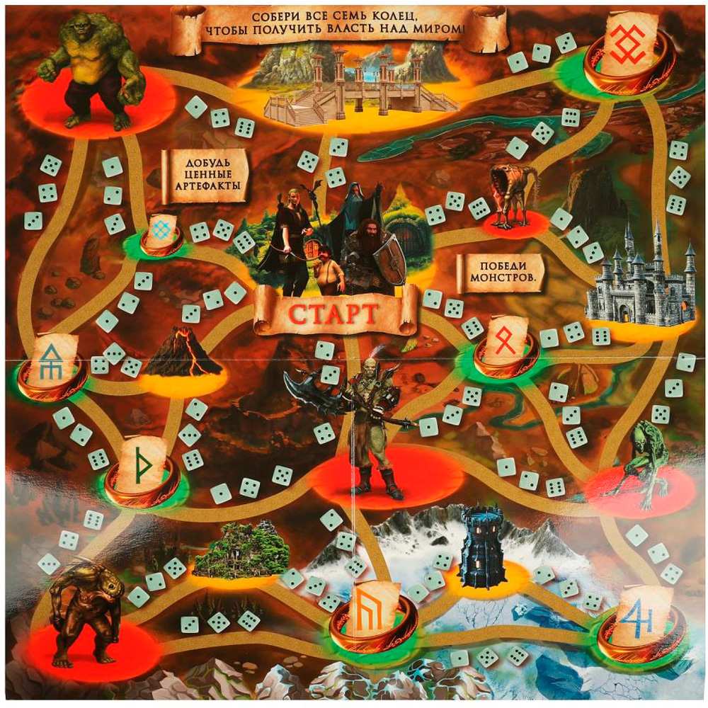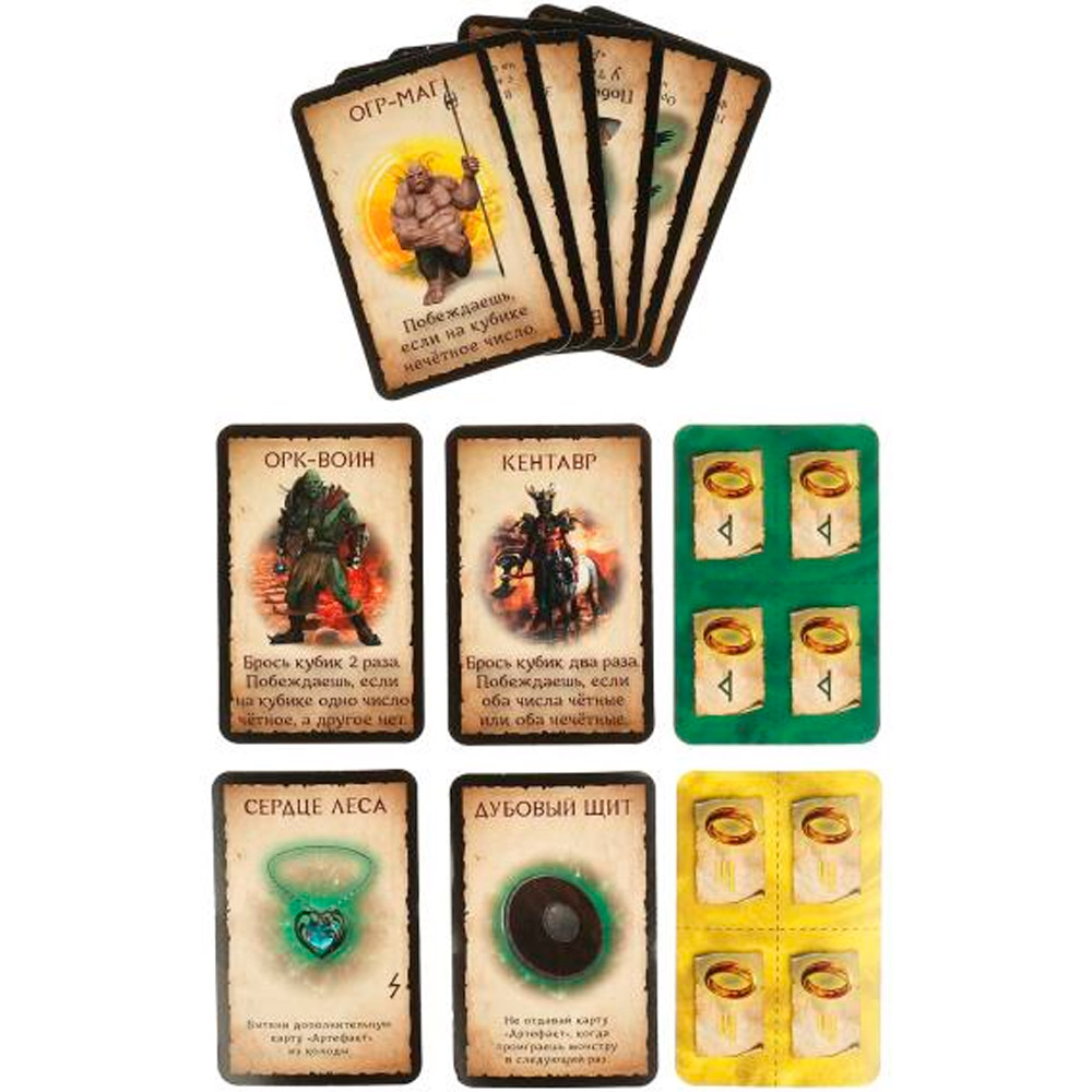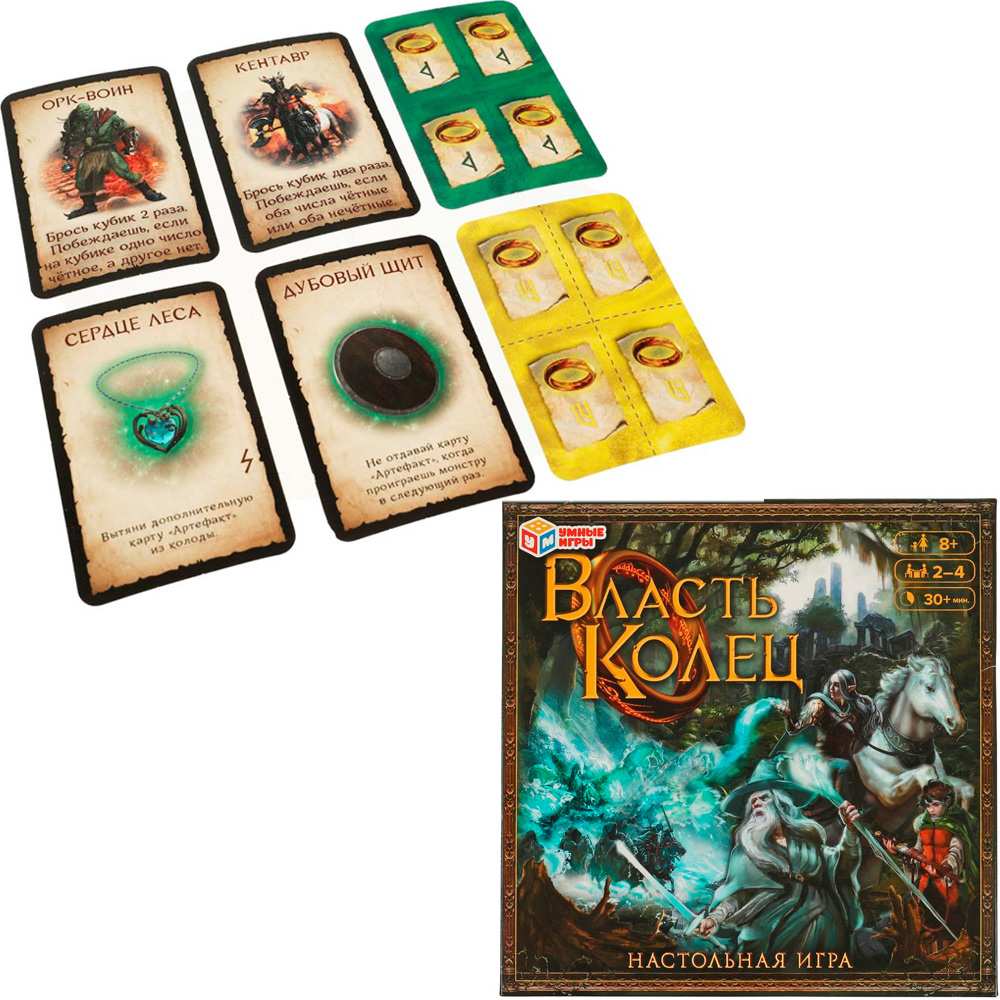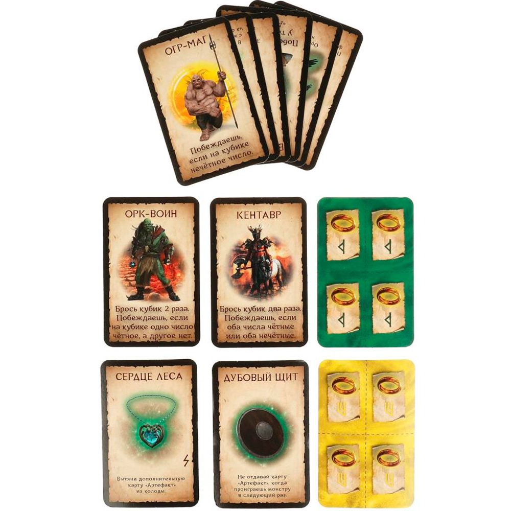 Комплектация: игровое поле, 28 карточек колец, 12 карточек «Монстр», 21 карточка «Артефакт», 4 фишки и кубик, правила игры