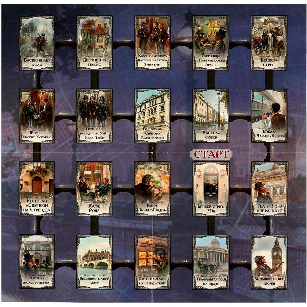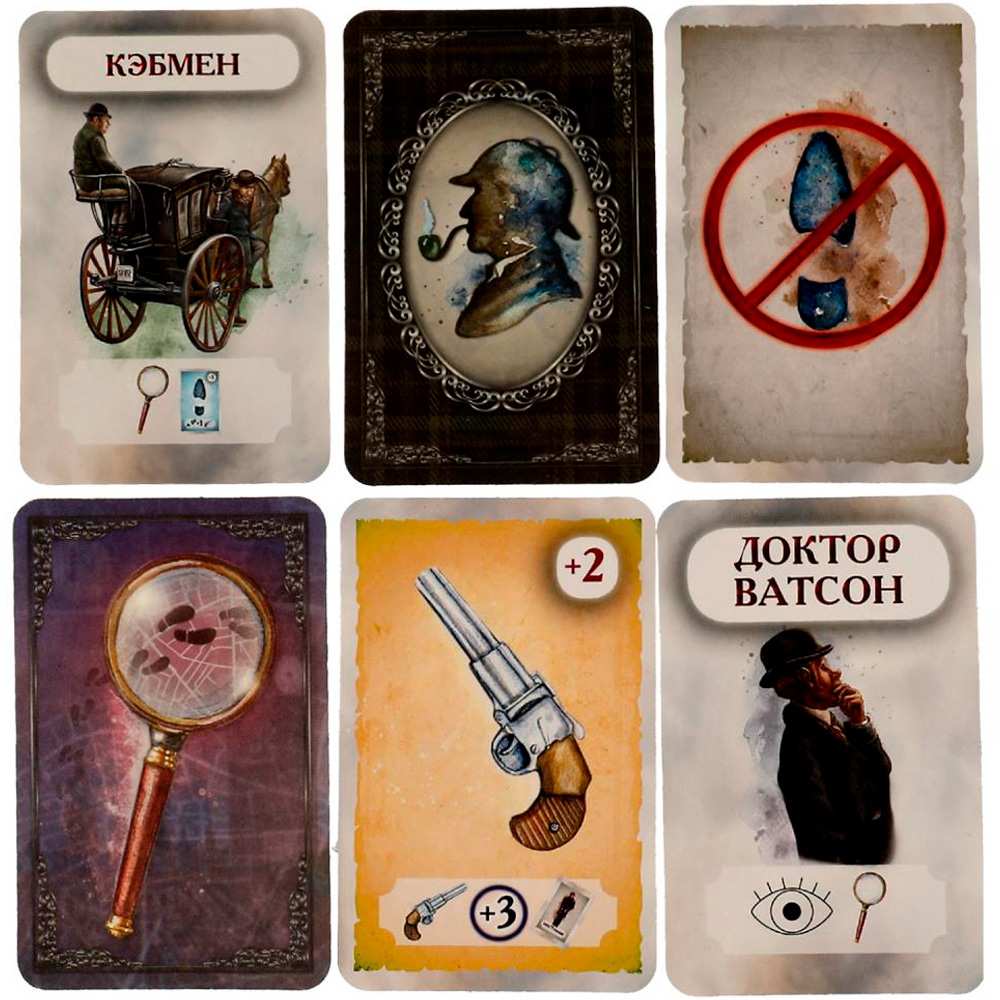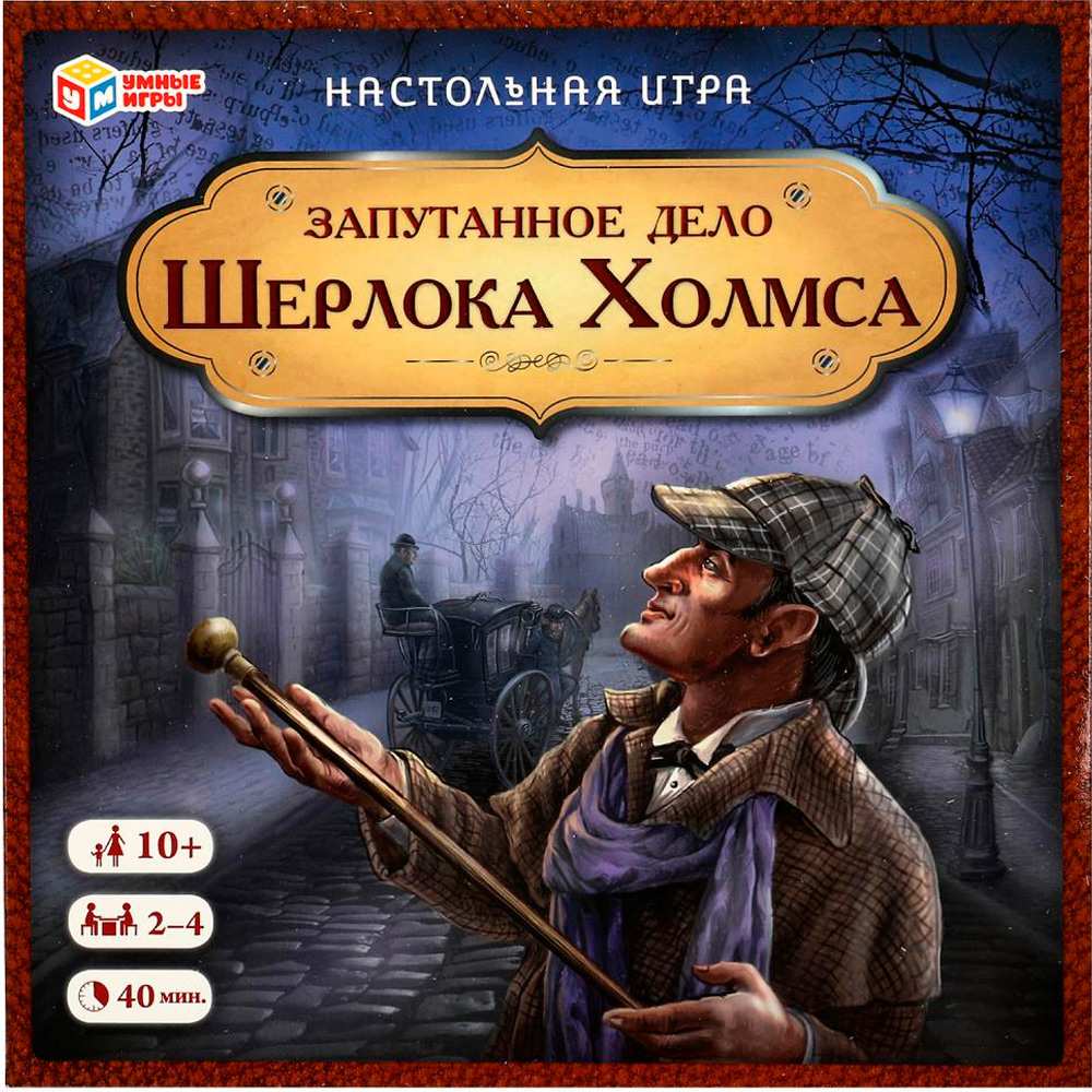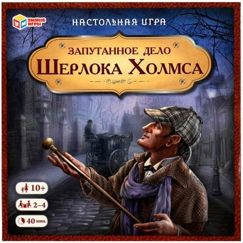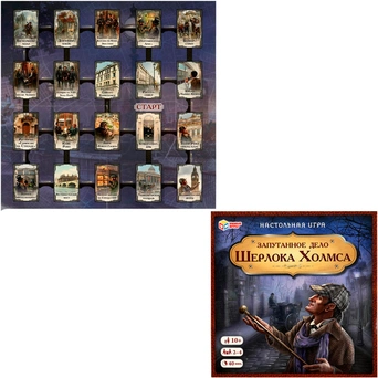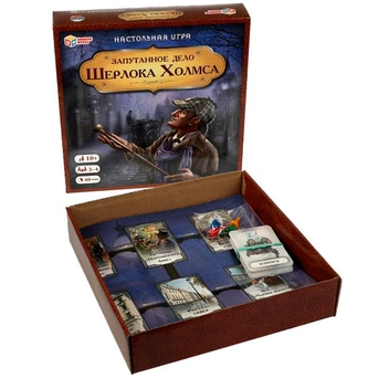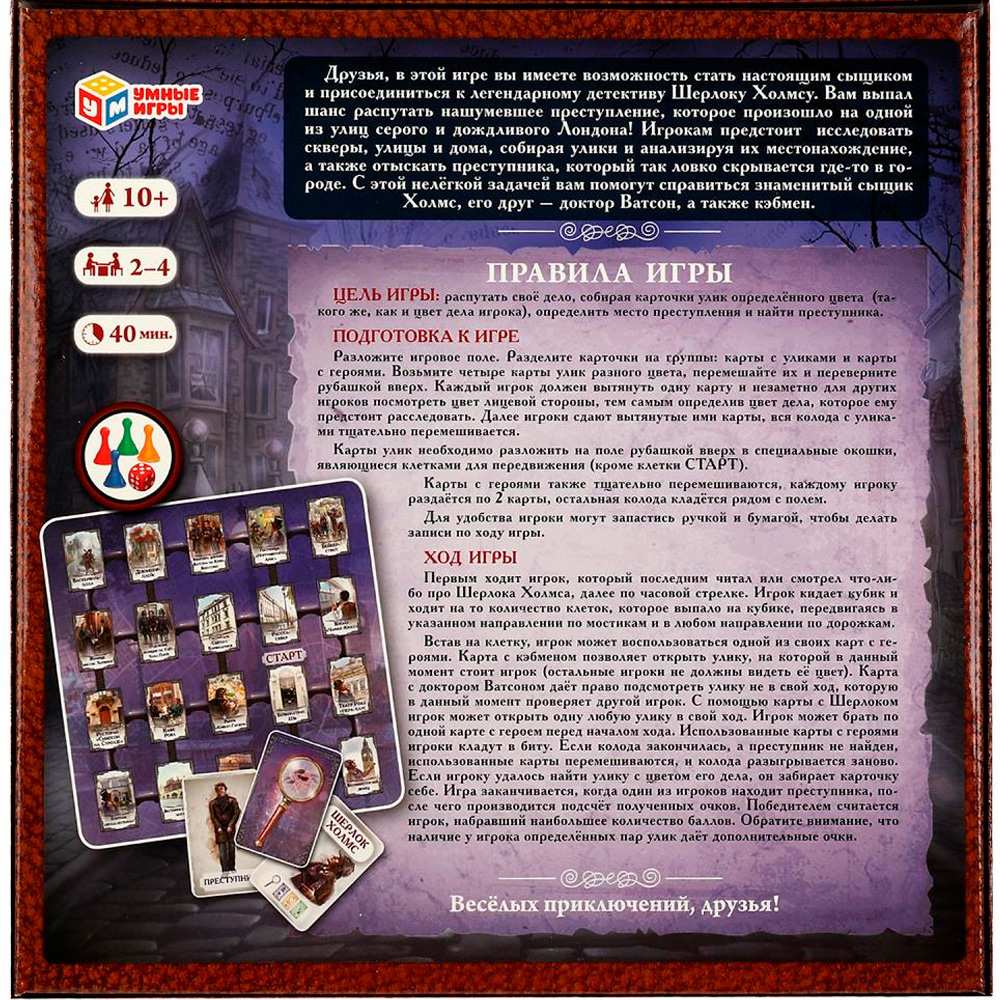 Комплектация: игровое поле, карты с героями, карты с уликами, 4 фишки, кубик, правила игры.