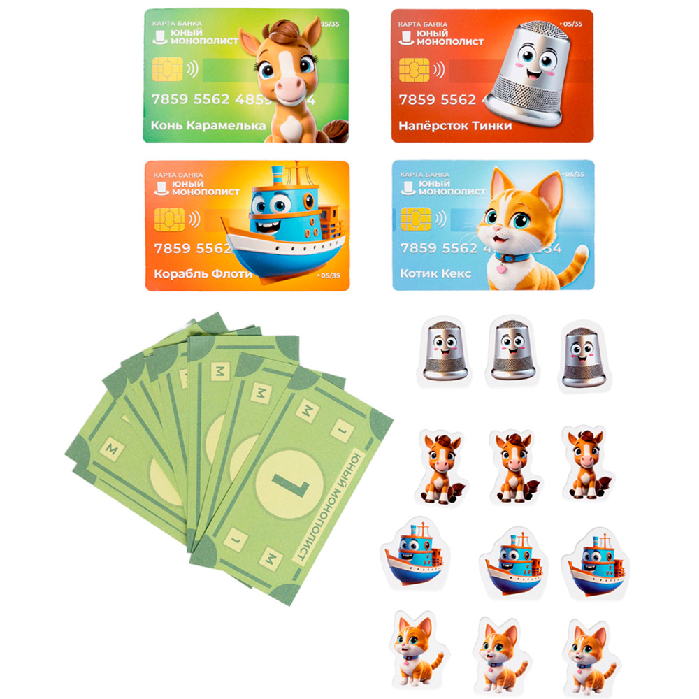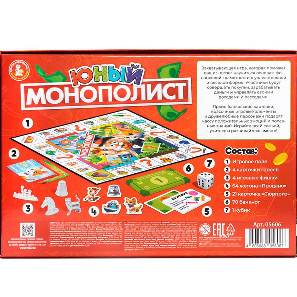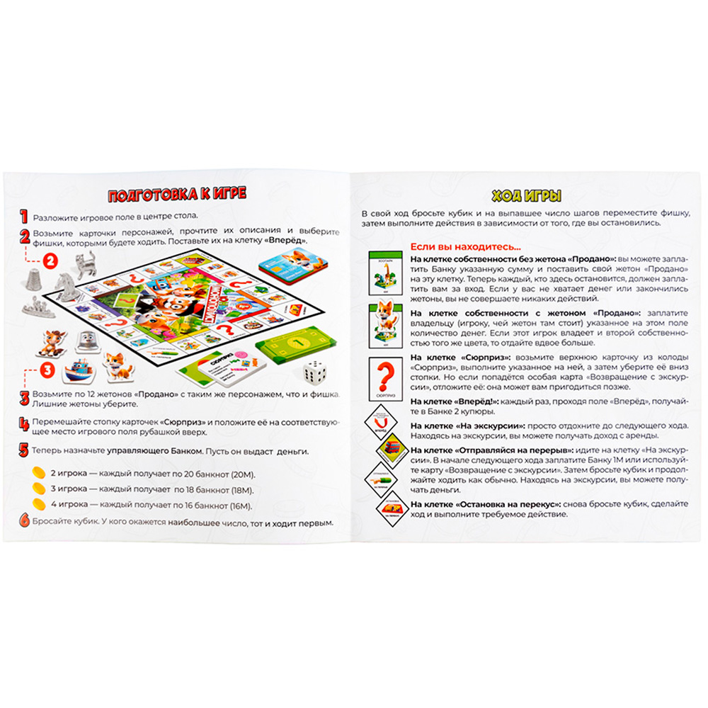 Комплектация: игровое поле 1 шт., карточка героя - 4 шт., игровые фишки - 4 шт., кубик - 1 шт., карточки "Сюрприз" - 21 шт., жетоны "Продано" - 64 шт., игровые деньги - 70 шт., правила
