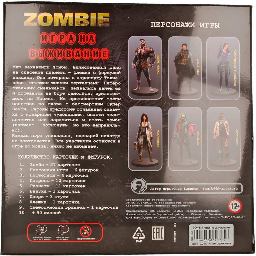 Комплектация: зомби 27 карточек, персонажи - 6 шт., пистолеты - 4 карточки, патроны - 10 карточек, гранаты - 11 карточек, базука - 1 карточка, двери - 3 шт., флешка - 1 карточка, светошумовая граната - 1 карточка, правила