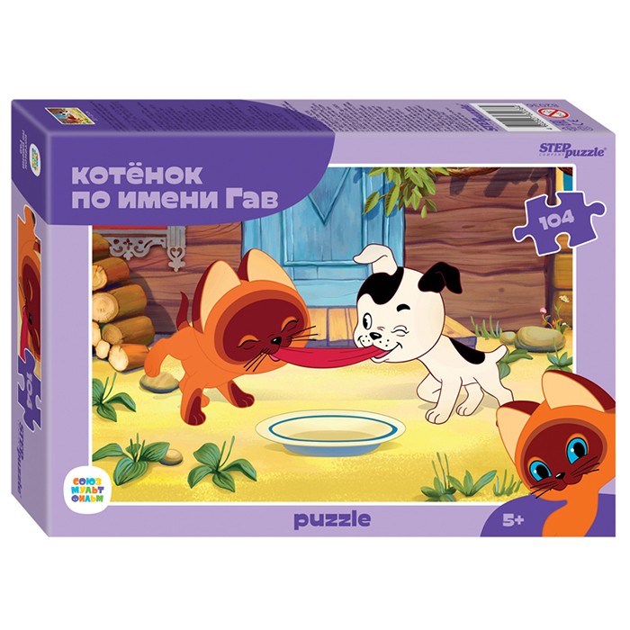 Пазл «Котенок по имени Гав» основан на сюжете известного детского мультфильма компании «Союзмультфильм». На картинке изображена забавная и милая сцена как котенок Гав делит сосиску со своим другом щенком. Пазл «Котенок по имени Гав» содержит 104 детали (размер одной детали – 3х2,3 см). Крупные детали позволят малышам удобно держать их в руках и складывать в изображение. Размер картинки – 33х23 см. Данный пазл подойдет деткам от 3 лет.