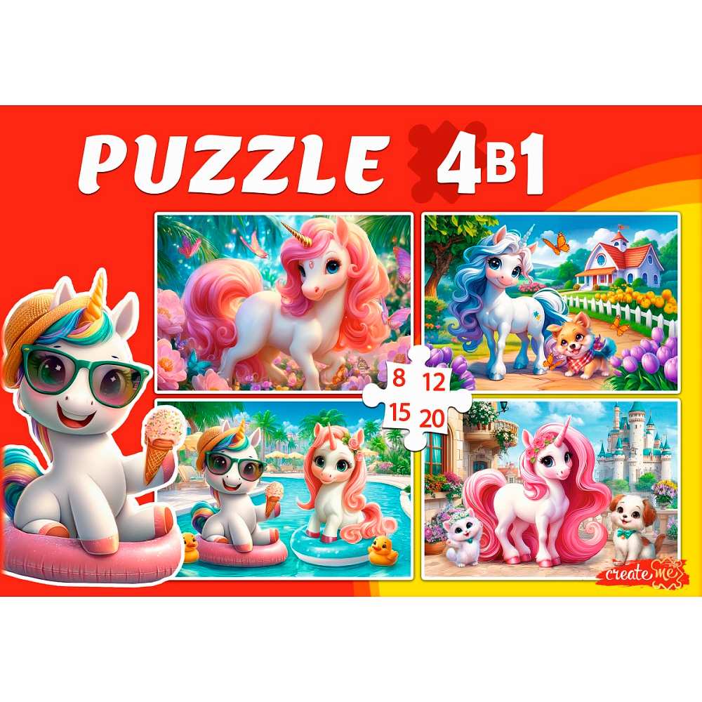 Пазл 4 в 1 Яркие единороги 8, 12, 15, 20 эл. П-3414