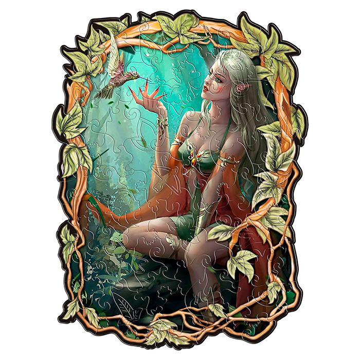 Фигурный пазл из дерева Эльфийка и колибри – это яркие краски, эльфийский сюжет, фантастические птицы.