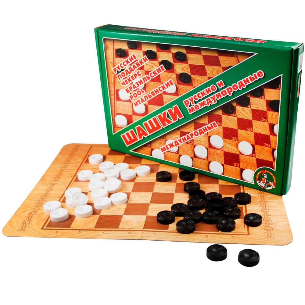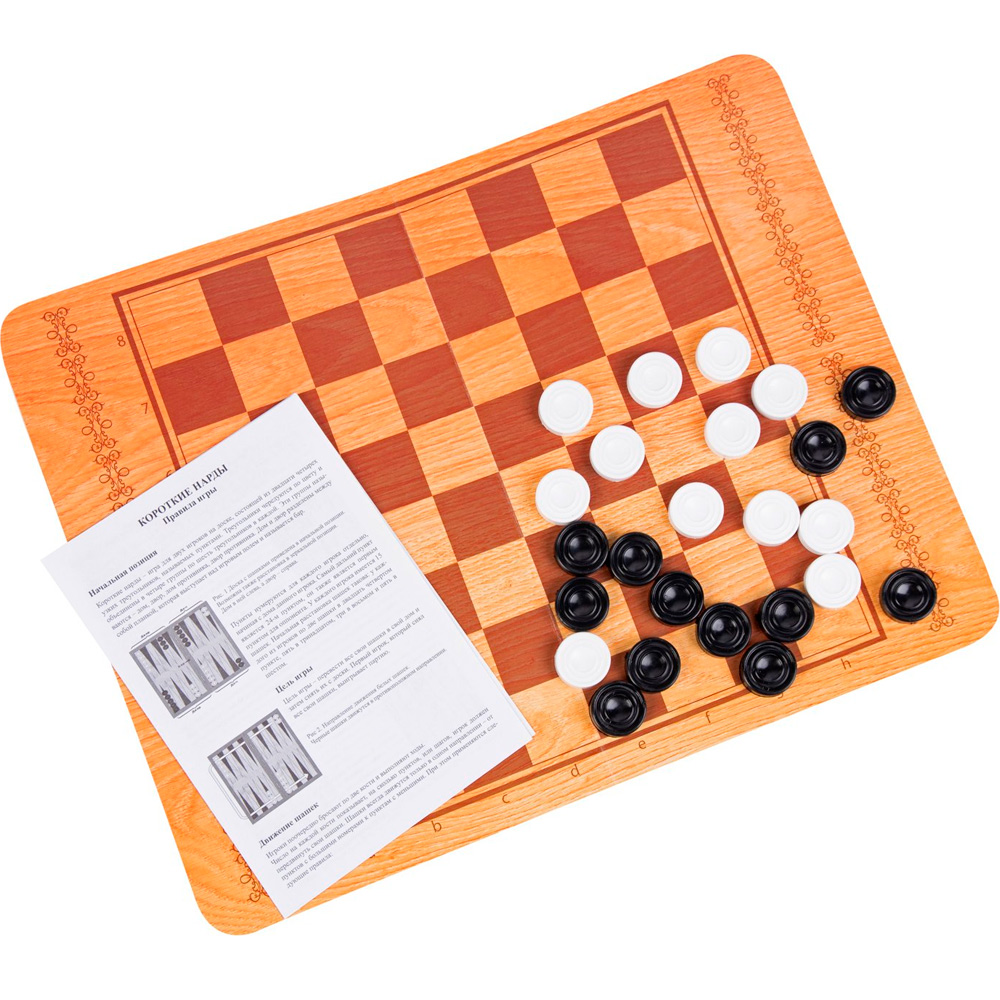 Комплектация: 1 двустороннее поле, 40 пластмассовых шашек.Материал: картон, пластик