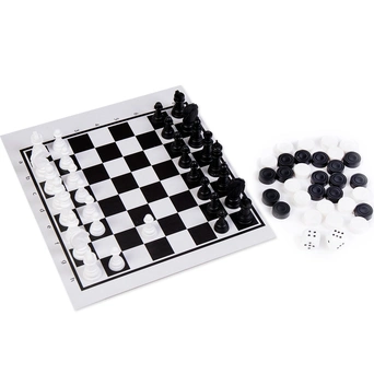 Комплектация: жесткое двустороннее поле, маленькие пластмассовые шашки - 30 шт (15 белых и 15 черных), небольшие пластмассовые шахматные фигурки 32 шт. (16 белых фигур и 16 черных), 2 кубика, правила игры в нарды.Высота шахматных фигурок от 2,5 см (пешки) до 4,5 см (король), диаметр шашки - 1,7 см