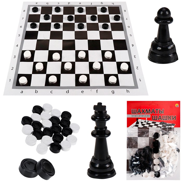 Комплектность: игровое поле 28,5*28,5 см, шахматные фигуры - 32 шт., шашки - 24 шт.