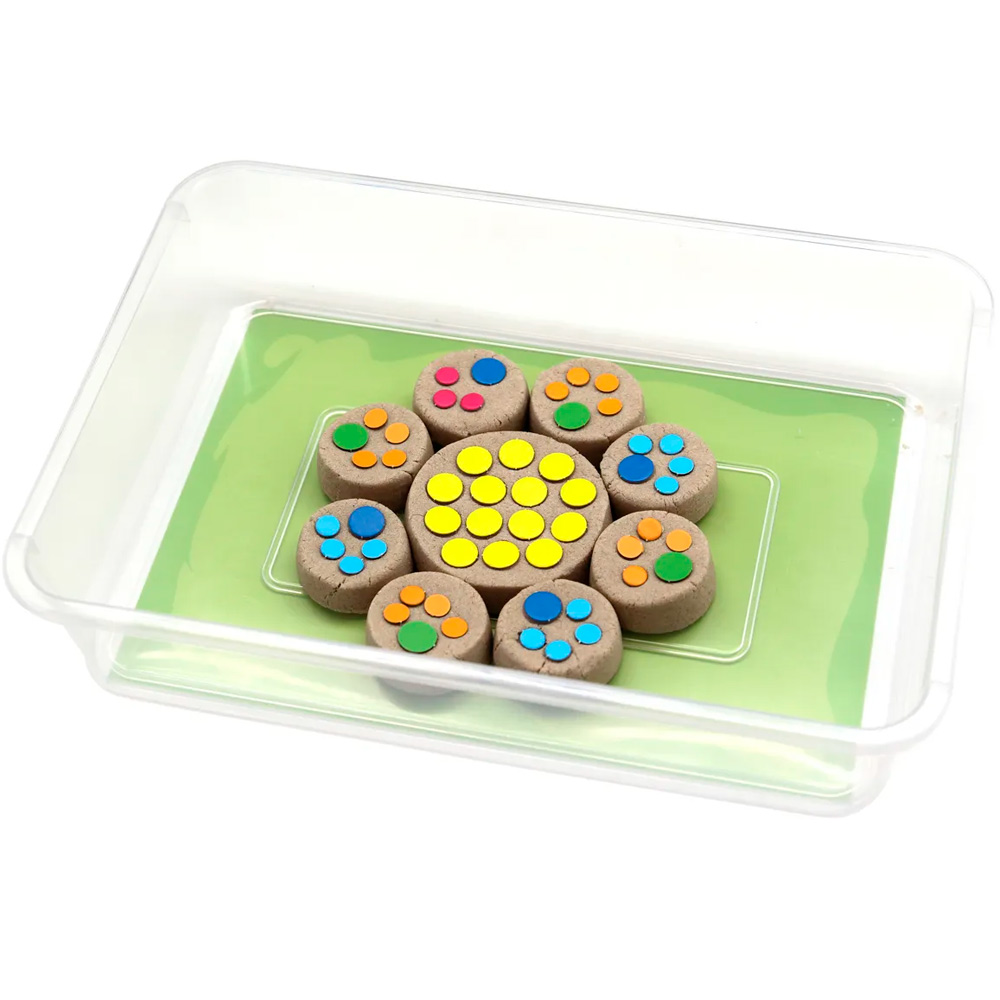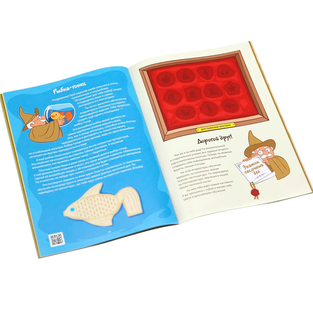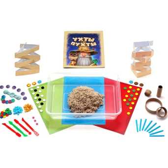 Комплектация: книга сказок и заданий - 1 шт, кинетический песок - 1 кг, песочница - 1 шт, набор стеков для лепки - 1 шт, элементы украшения - 121 шт, набор счётных палочек - 1 шт, мини-скалка - 1 шт, картонные подложки - 3 шт, пакеты для хранения - 2 шт, картонные формочки: 5 квадратных, 5 треугольных, 3 круглых