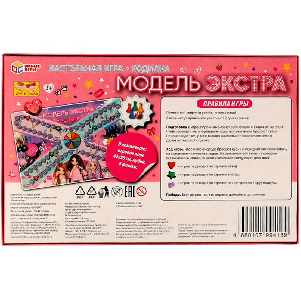 Комплектация: игровое поле - 1 шт., фишка - 4 шт., кубик - 1 шт., правила игры