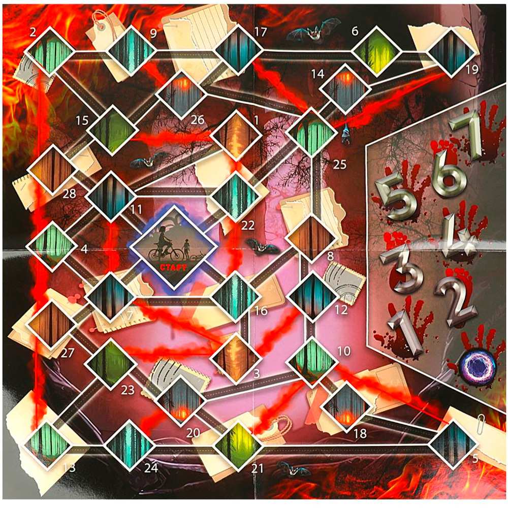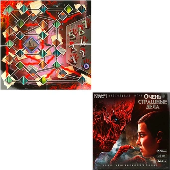 Комплектация: игровое поле, 4 жетона здоровья, 30 жетонов поиска, 7 жетонов параллельного мира, 3 жетона помощи, 5 жетона улик четырех цветов, 14 карт «Телекинез», 20 карт «Тайна», 10 карт «Диверсия», 40 жетонов репутации, 4 фишки, игральный кубик, правила