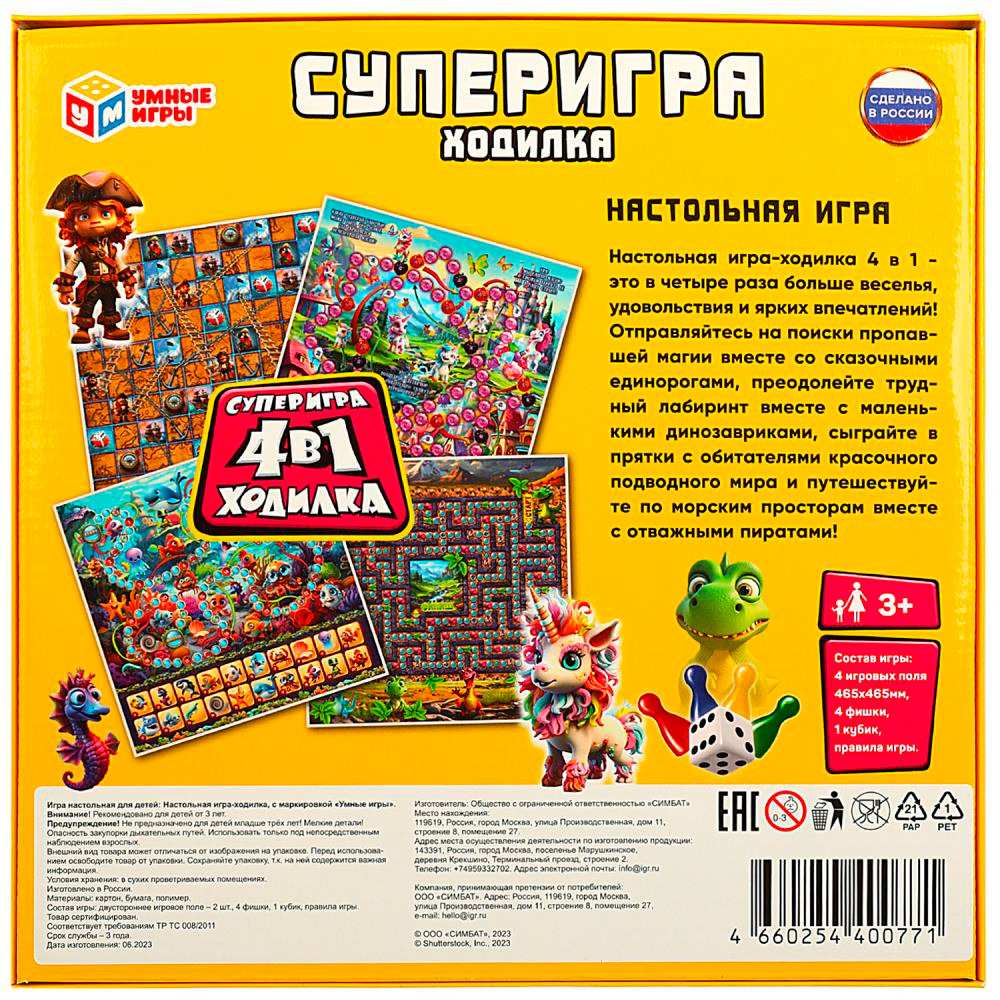 Комплектация: игровое поле - 4 шт., фишка - 4 шт., кубик - 1 шт., правила игры
