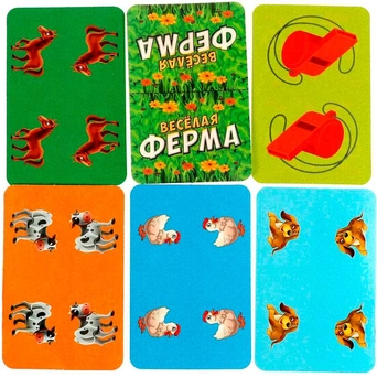 Комплектация: игровое поле, 8 карт «Капкан», 12 карт «Свисток», 32 карты с курами, 24 карты с козами, 24 карты со свиньями, 8 карт с коровами, 16 карт с лошадьми, 8 карт с маленькими собаками, 8 карт с большими собаками