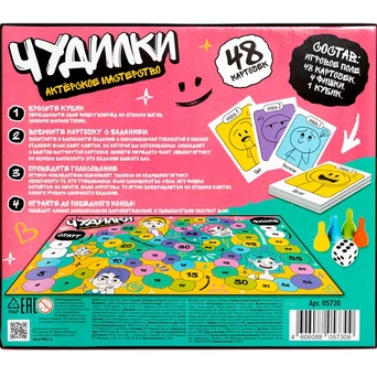 Комплектация: игровое поле - 1 шт., карточка - 48 шт., фишка - 4 шт., кубик - 1 шт., правила игры