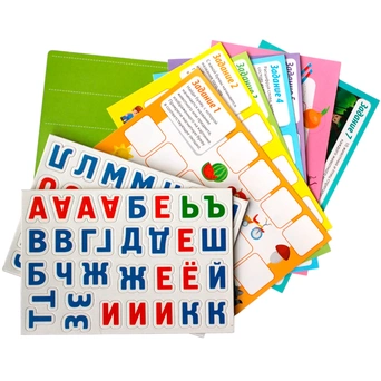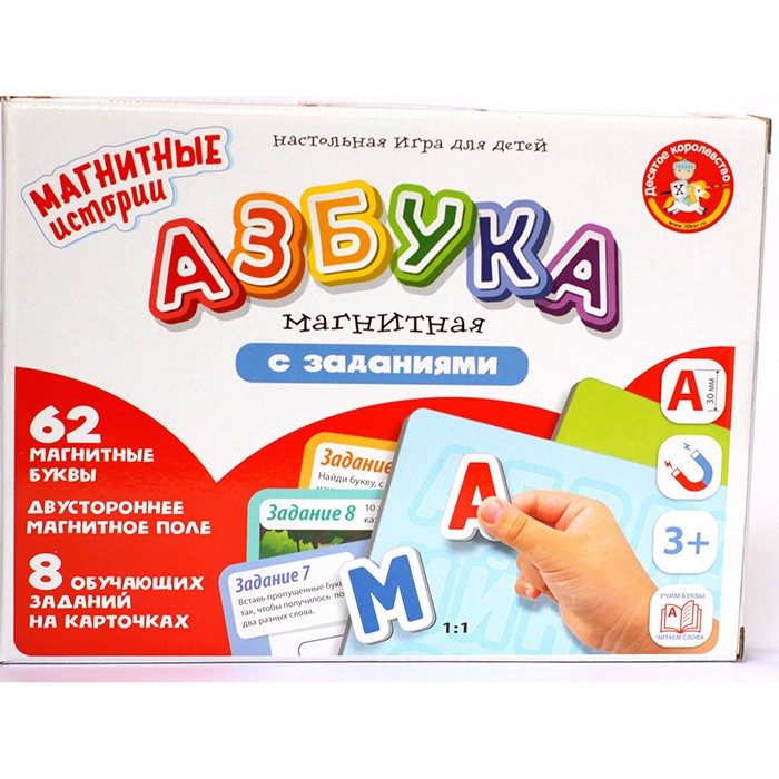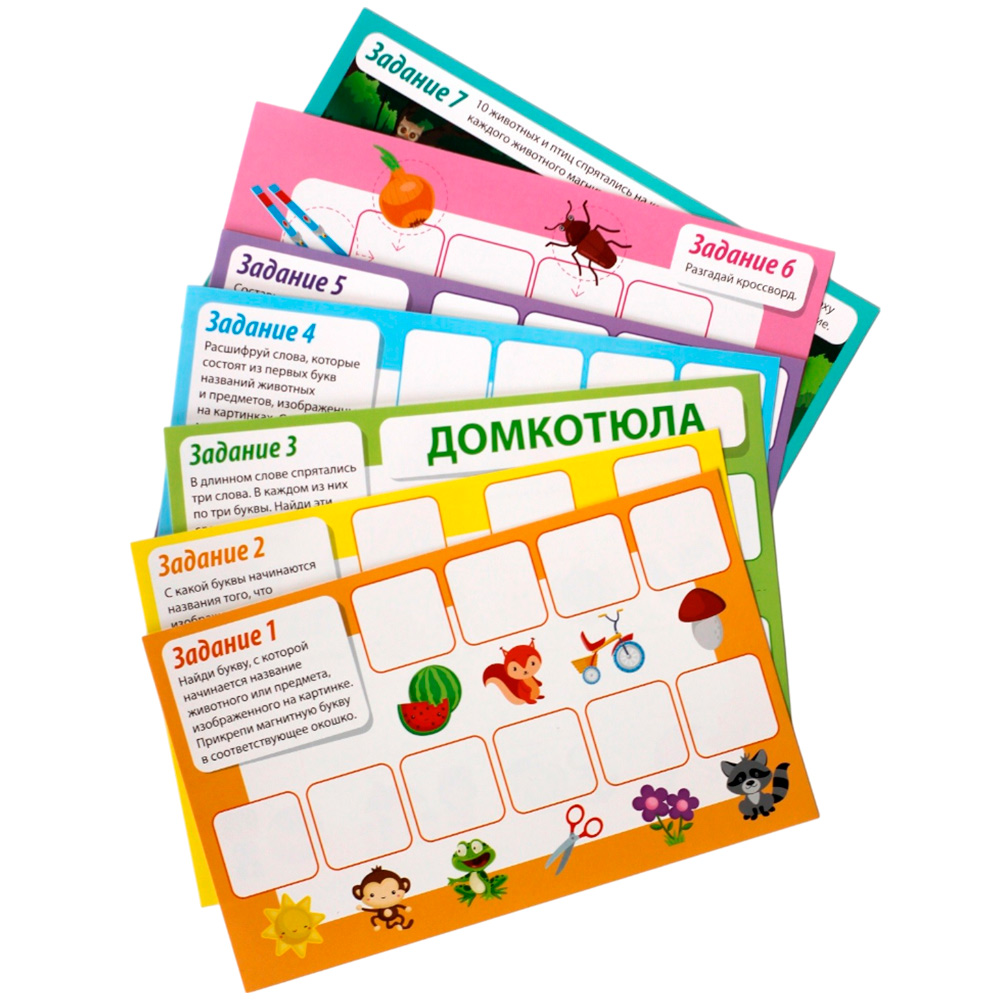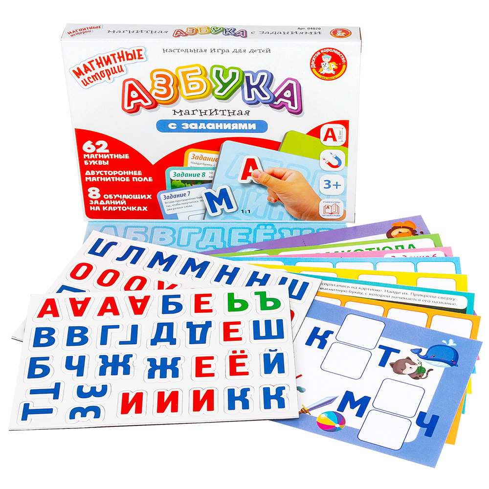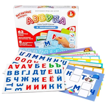 Комплектация: двустороннее магнитное поле, 62 магнитные буквы, 8 заданий на карточкахМатериал: картон, магнит