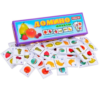 Домино - это веселая настольная игра для дружной компании. Игра состоит из пластмассовых карточек. На лицевую сторону нанесено изображение фруктов, ягод и грибов и цифры. Играя в домино, ребенок сможет получить представление о внешнем виде различных фруктов, познакомится с цифрами, будет тренировать логику и мышление. Изображения красочно и качественно напечатаны. Каждый игрок должен добавить в цепочку из фишек одну их своих фишек так, чтобы изображение на ней подошло к изображению на конце цепи. Если в руках у игрока нет подходящей фишки, он берет дополнительные до тех пор, пока не попадется нужная. Выигрывает тот, кто первым выложит все свои фишки.