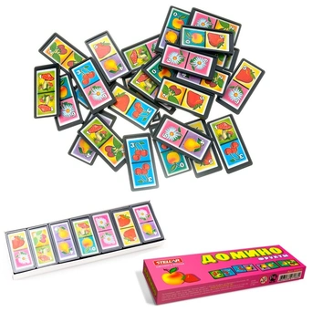 Домино - это веселая настольная игра для дружной компании. Игра состоит из пластмассовых карточек. На лицевую сторону нанесено изображение фруктов, ягод и грибов и цифры. Играя в домино, ребенок сможет получить представление о внешнем виде различных фруктов, познакомится с цифрами, будет тренировать логику и мышление. Изображения красочно и качественно напечатаны. Каждый игрок должен добавить в цепочку из фишек одну их своих фишек так, чтобы изображение на ней подошло к изображению на конце цепи. Если в руках у игрока нет подходящей фишки, он берет дополнительные до тех пор, пока не попадется нужная. Выигрывает тот, кто первым выложит все свои фишки.