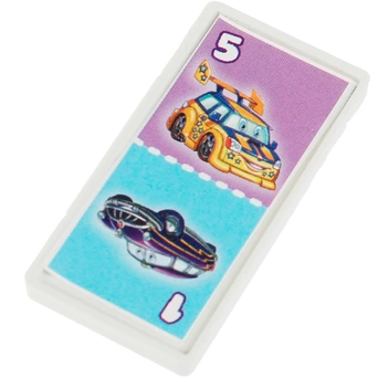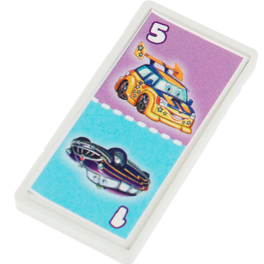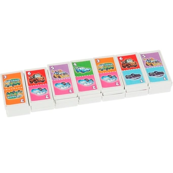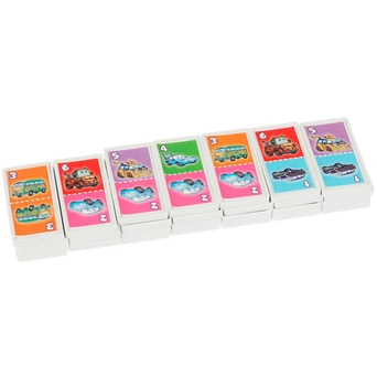 Набор включает яркие фишки для игры, разделённые на 2 части. На каждой из частей есть картинка с изображением той или иной машинки на фоне разного цвета, а также цифра.