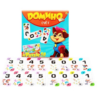Помимо пазла, в набор входит домино - игрокам предстоит по очереди выкладывать на стол костяшки так, чтобы совпадало изображение и цифра.