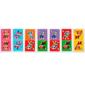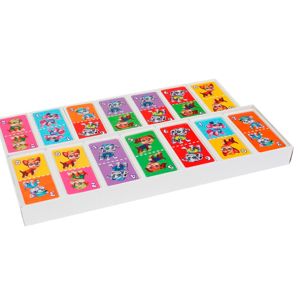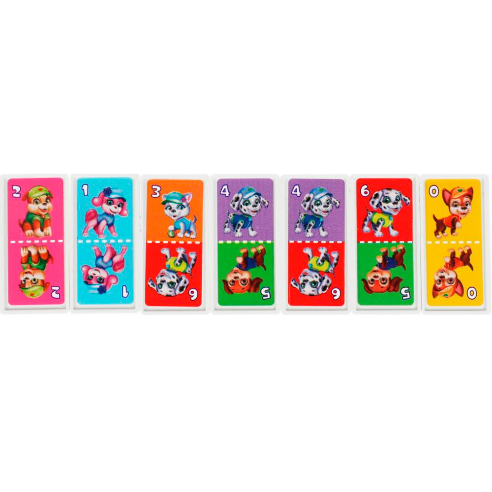 Набор включает яркие фишки для игры, разделённые на 2 части. На каждой из частей есть картинка с изображением того или иного щенка на фоне разного цвета, а также цифра.