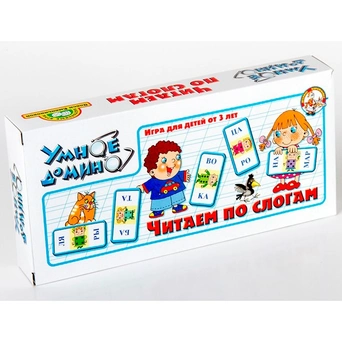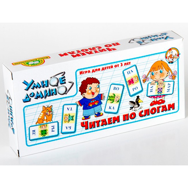 В состав умного домино «Читаем по слогам» входят 36 карточек, каждая из них разделена на две части. На каждой половинке написан слог. Смысл этой игры заключается в том, чтобы в игровой форме, участники игры складывали слова. Например: первый игрок выложил карточку со слогами РАН и ДУ, второй игрок может выложить (одну или две) свои карточки, таким образом, чтобы из слогов получилось слово БАРАНКА.