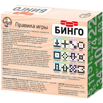 Игра продолжается до тех пор, пока один из игроков не выстроит на своей карточке загаданную фигуру (или похожую на неё) или же пока не закончатся фишки в мешочке.