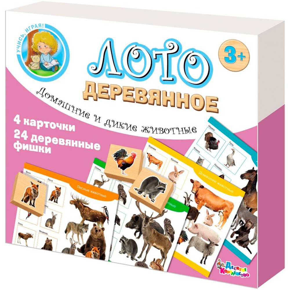 Деревянное лото "Домашние и дикие животные", представленное торговой маркой "Десятое Королевство", станет увлекательным времяпрепровождением для ребенка. В комплекте находятся четыре карточки и фишки с изображениями различных животных. С таким набором можно придумать несколько сценариев игры, например, участники могут угадывать названия животных, изображенных на фишках. Это поможет детям расширить кругозор, увеличить лексический запас, улучшить память.