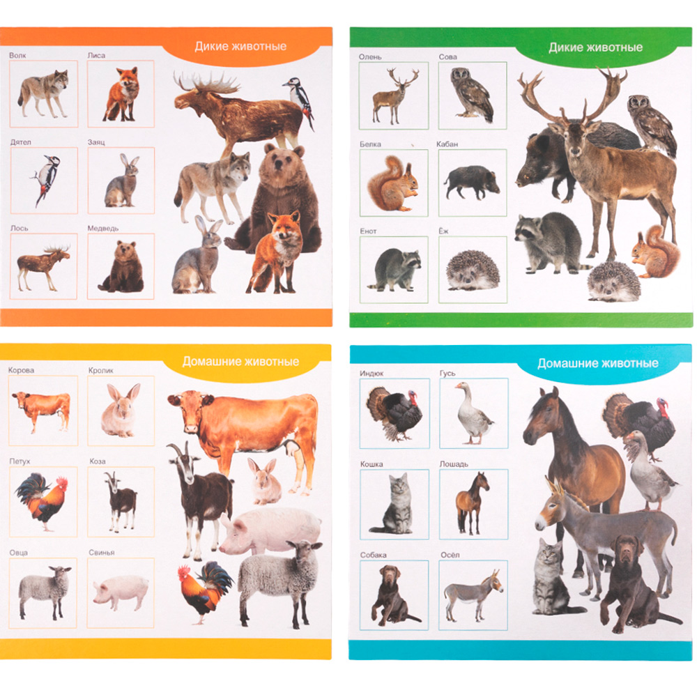 Возраст: от 3 летКомплект: 4 картонные карточки с тематическим картинками домашних и диких животных, 24 фишки.