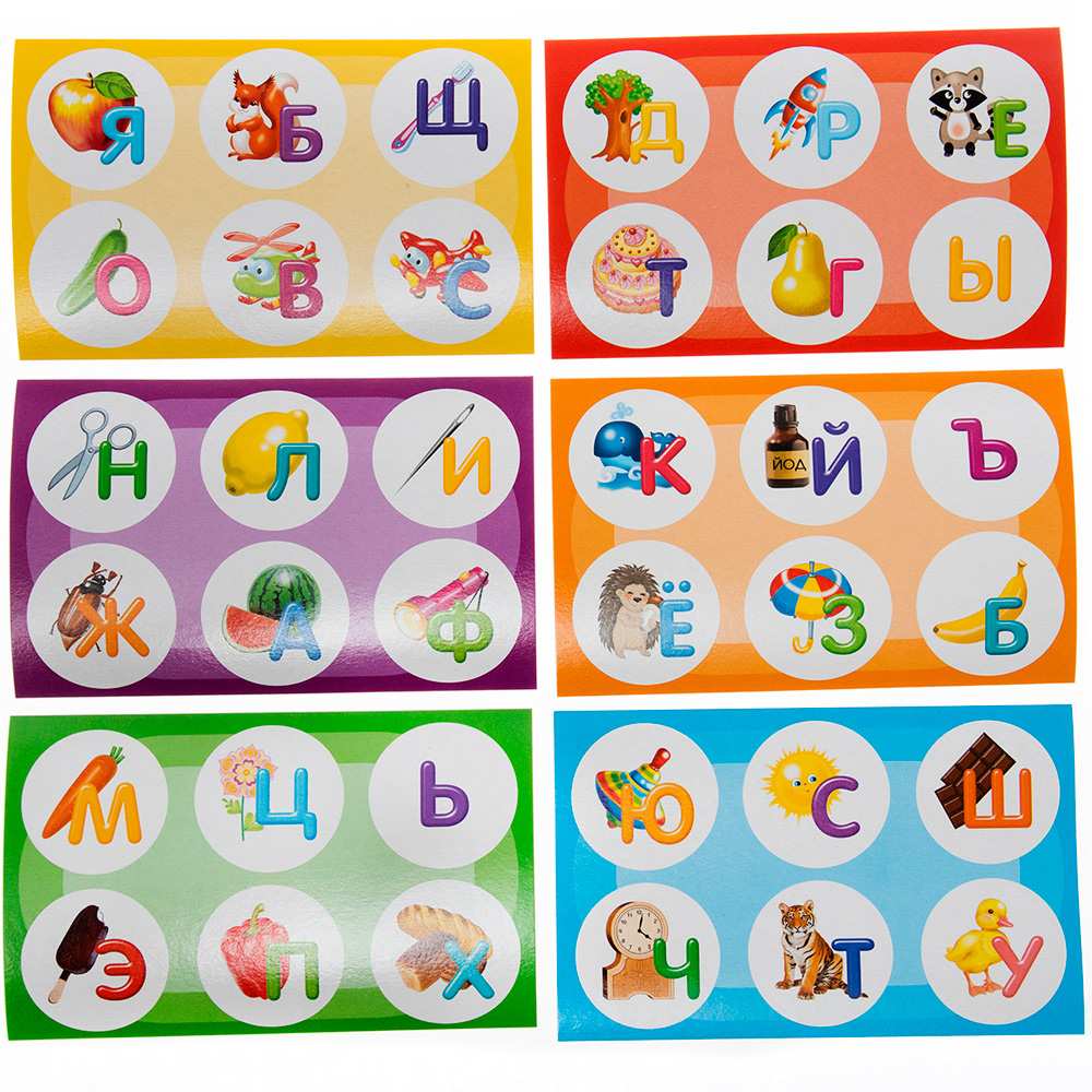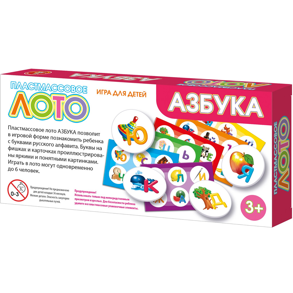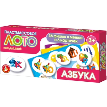 Изучайте вместе с малышом алфавит в игровой и легкой форме, сопоставляя фишки с картинками на карточках. Лото «Азбука» предназначена для детей от 3 лет. Участникам раздаются игровые поля, на которых содержится 6 картинок с буквами и предметами, название которых начинается на эту букву. Задача заключается правильно подобрать фишки к картинкам на карточках. Ведущий складывает все фишки в мешочек, а затем вытаскивает по одной и называет букву, изображённую на ней. Игроки ищут на своих карточках объекты, названия которых начинаются с этой буквы. Тот, кто быстрее всех обнаружил такую картинку на своей карточке, забирает себе фишку и закрывает ею нужную картинку. Лото «Азбука» развивает память, усидчивость, внимательность, аккуратность и тренирует мелкую моторику рук.