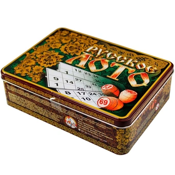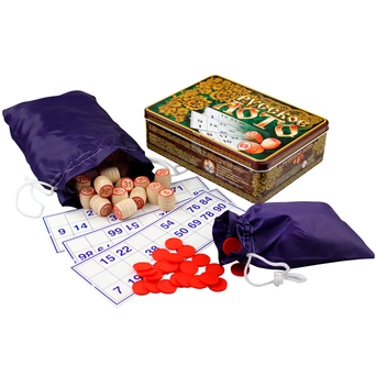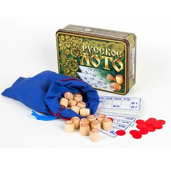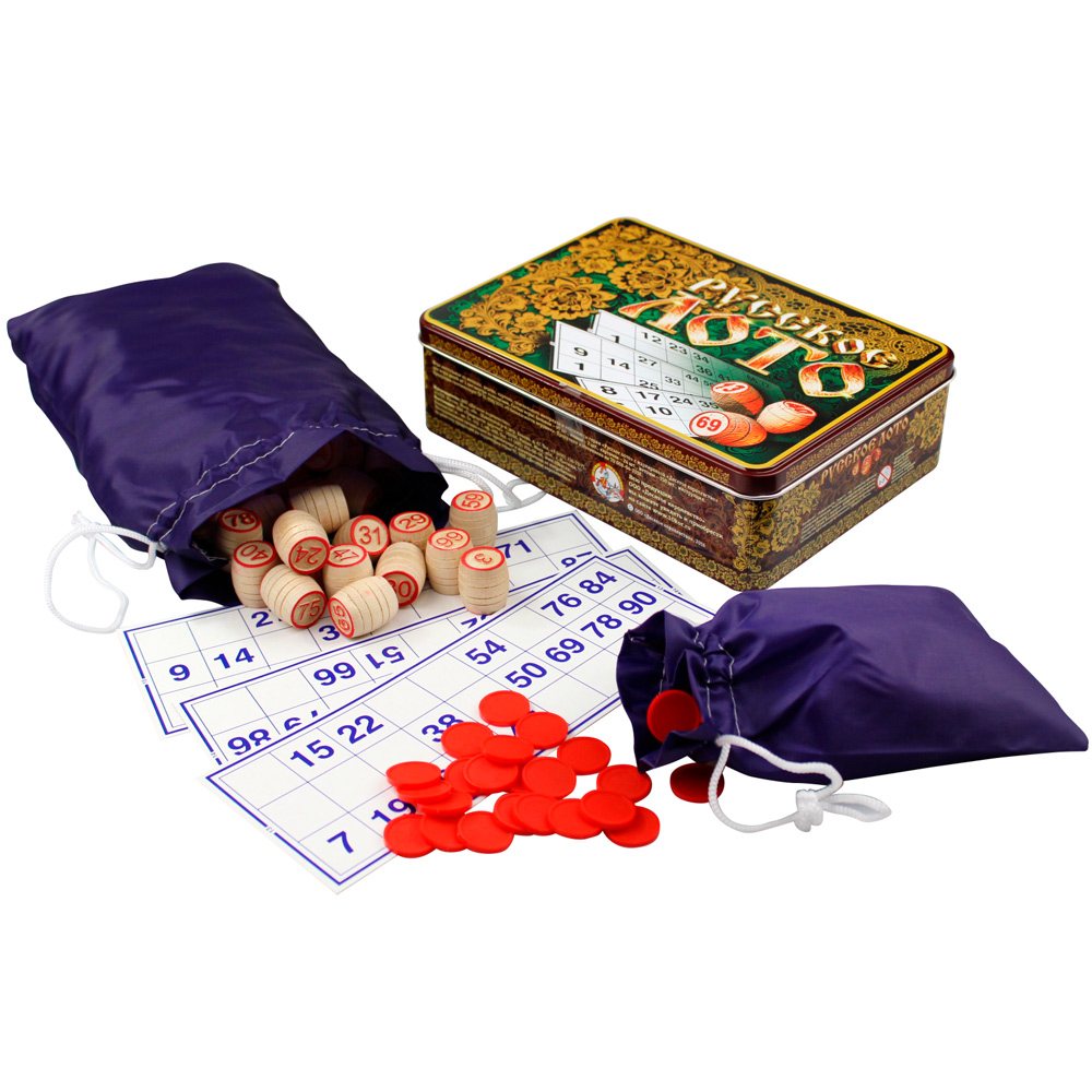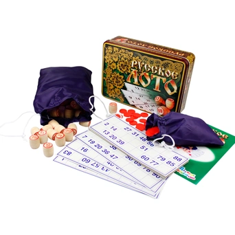 Возраст: от 3 летКомплект: 24 карточки, 90 бочонков, 150 жетонов, 2 мешочка полотняных, правила игры, жестяная коробка.