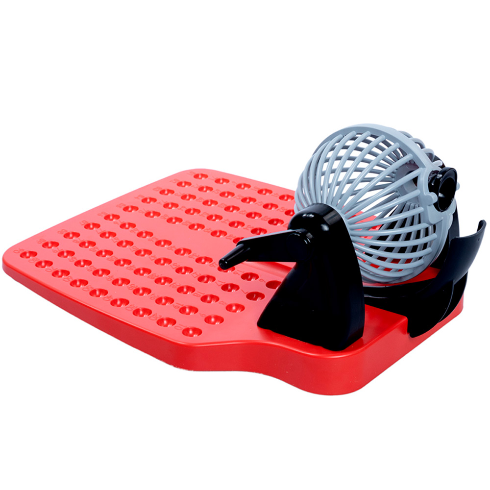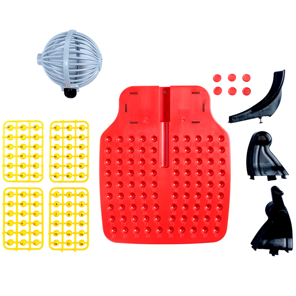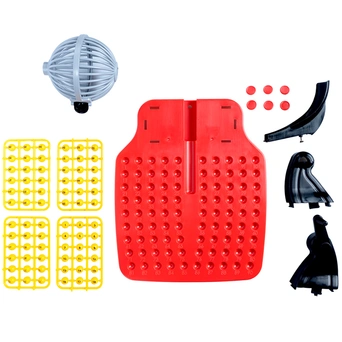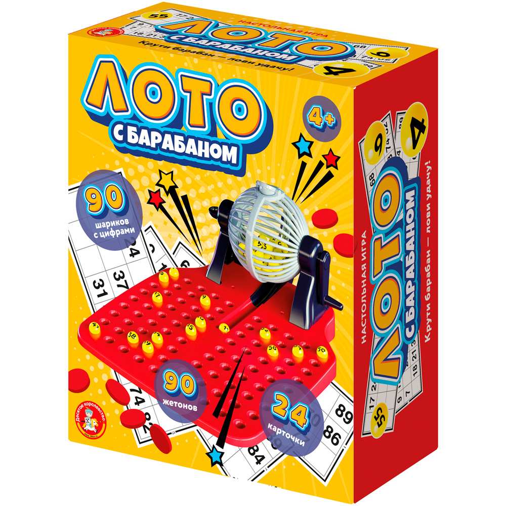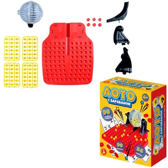 Комплектация: игровое поле - 1 шт, барабан - 1 шт, подстака под барабан - 1 шт, карточки - 24 шт, шарики - 90 шт, фишки - 90 шт