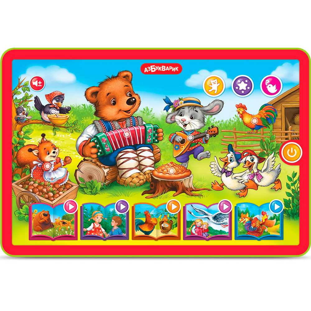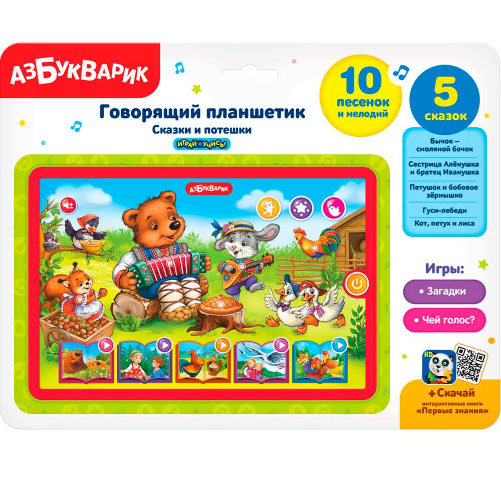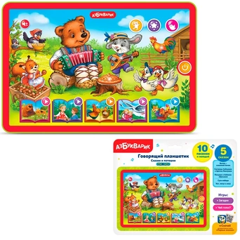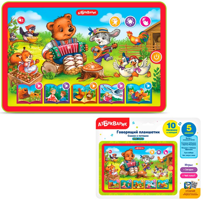 В этом говорящем планшетике с яркой сюжетной картинкой собрано 5 сказок («Бычок – смоляной бочок», «Сестрица Аленушка и братец Иванушка», «Петушок и бобовое зернышко», «Гуси-лебеди», «Кот, петух и лиса») и лучшие народные потешки. Весёлые игры («Загадки» и «Чей голос?») не только развлекают, но и развивают у ребёнка память и воображение. Нажимай на кнопочки – слушай сказки и потешки, играй со сказочными персонажами!+ Бонус: возможность скачать интерактивные книги из серии «Первые знания» для мобильного или планшета по QR-коду на упаковке.