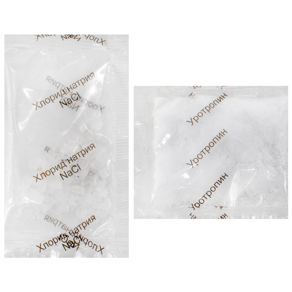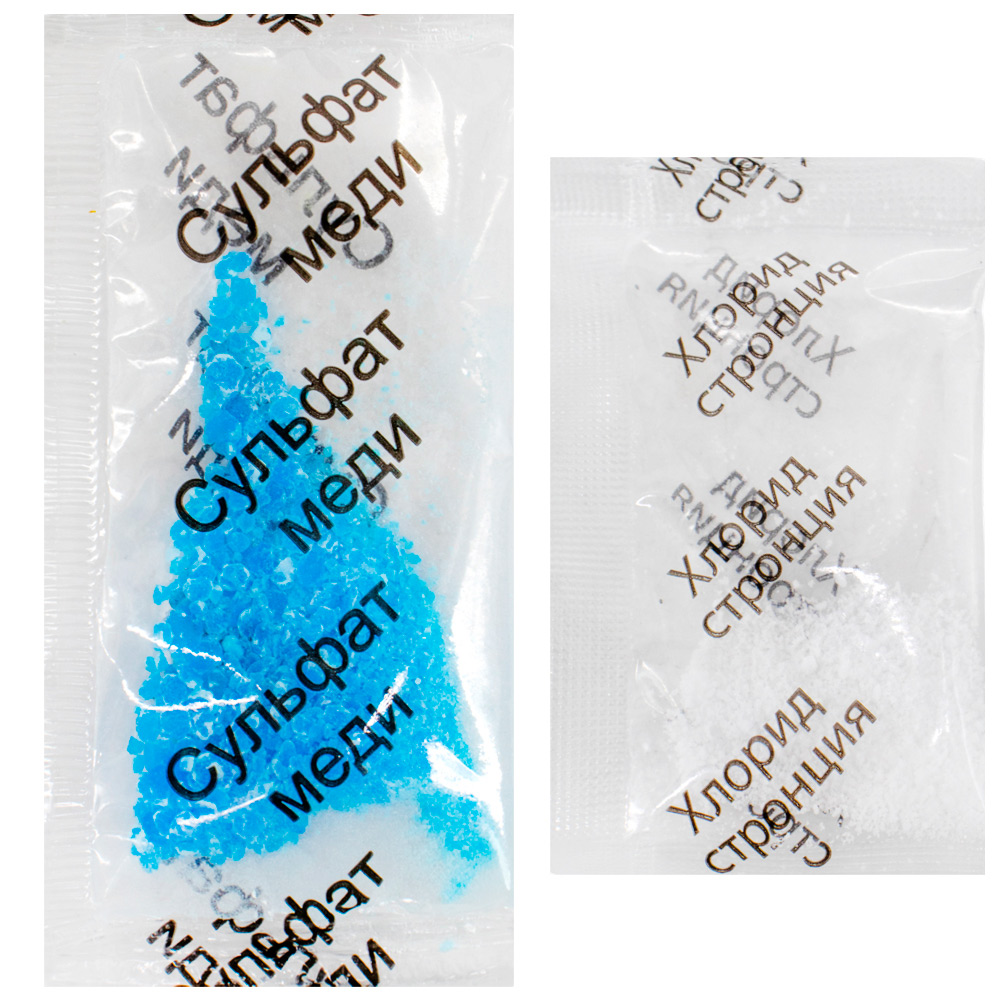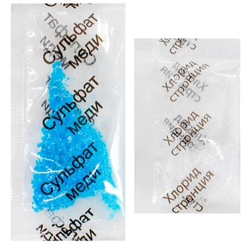 Комплектация: три металлические чашечки, уротропин на 3 раза, перчатки, сульфат меди, хлорид стронция, хлорид натрия