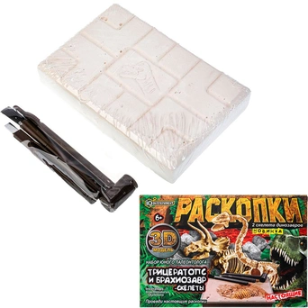 С помощью инструментов, входящих в набор, ребенок сможет снять с бруска слой гипса, откопать фигурку, а остатки гипса удалить щеточкой или при помощи воды.