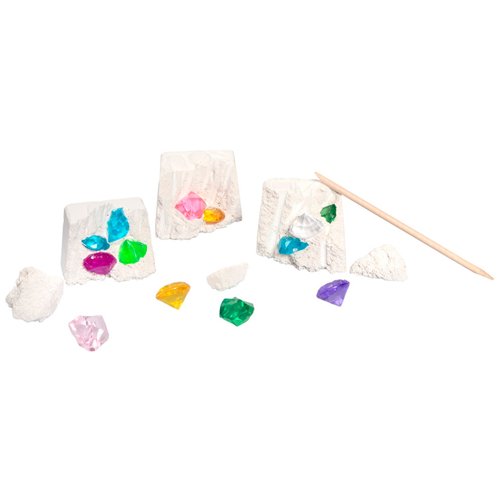 С помощью инструментов, входящих в набор, ребенок сможет снять с бруска слой гипса, откопать драгоценные камни, а остатки гипса удалить щеточкой или при помощи воды.