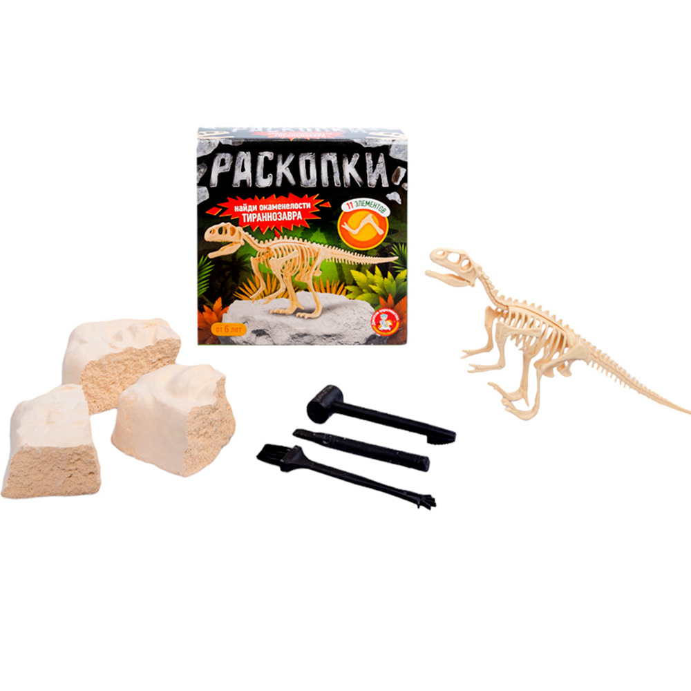 Комплектация: брусок гипсовый - 1 шт., щетка - 1 шт., стек - 1 шт., молоток - 1 шт., кости тираннозавра - 11 шт.