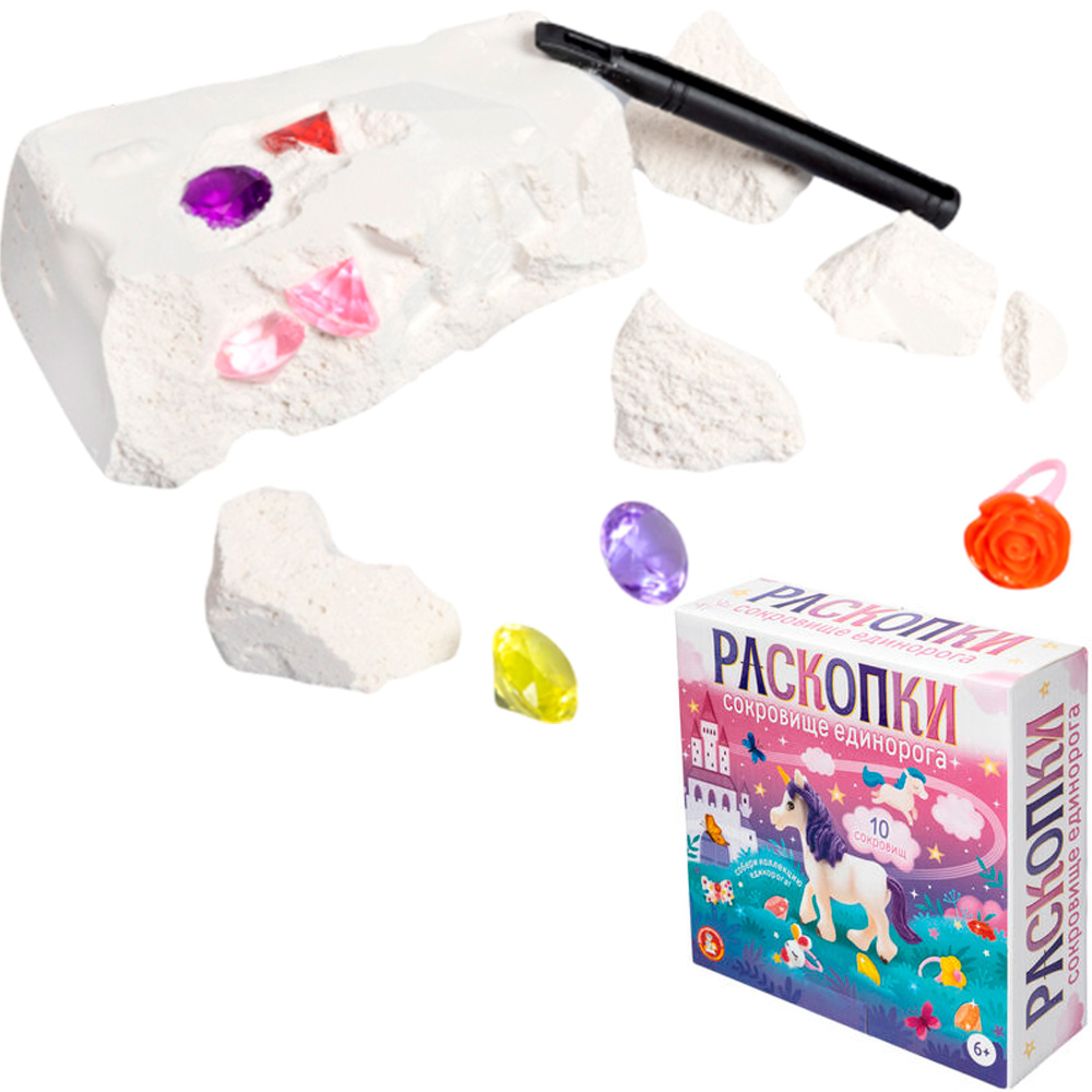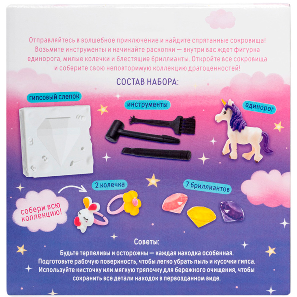 Комплектация: брусок гипсовый - 1 шт., единорог - 1 шт., колечки - 2 шт., бриллианты - 7 шт., молоток - 1 шт., щетка - 1 шт., стек - 1 шт.