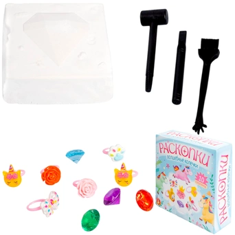 Комплектация: брусок гипсовый - 1 шт., колечки - 6 шт., бриллианты - 4 шт., молоток - 1 шт., щетка - 1 шт., стек - 1 шт.