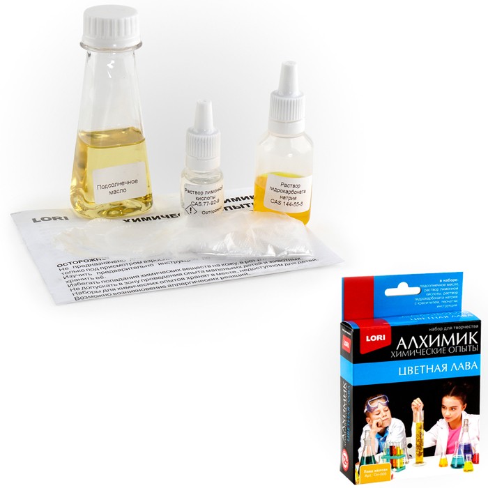 Набор из серии "Химические опыты" наглядно продемонстрирует ребёнку интересные и несложные химические опыты, помогут освоить базовые знания, расширят кругозор и привьют интерес к науке. Опыты могут быть проведены в домашних условиях и в условиях школьной лаборатории в кабинете химии. Этот набор познакомит юных исследователей с процессои создания лава-лампы - прозрачной колбы с переливающимися каплями цветной массы.