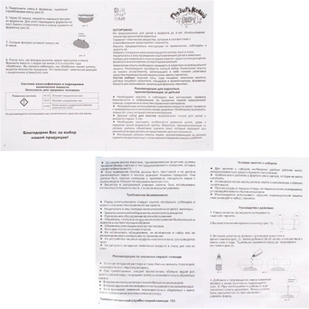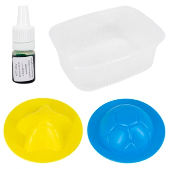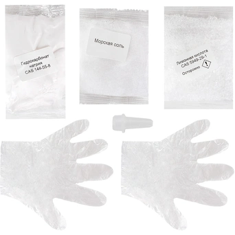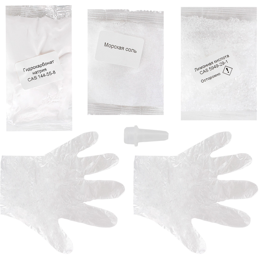 Комплектация: сода пищевая - 1 уп., лимонная кислота - 1 уп., морская соль - 1 уп., раствор (пищевой краситель, глицерин и ароматизатор) - 1 уп., формочка - 2 шт., ёмкость - 1 шт., дозатор - 1 шт., перчатки - 1 пара, инструкция - 1 шт.