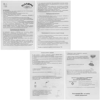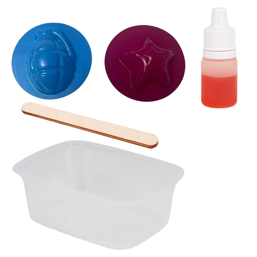 Комплектация: сода пищевая - 1 уп., лимонная кислота - 1 уп., морская соль - 1 уп., раствор (пищевой краситель, глицерин и ароматизатор) - 1 уп., формочка - 2 шт., ёмкость - 1 шт., дозатор - 1 шт., перчатки - 1 пара, инструкция - 1 шт.