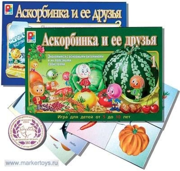 Настольная игра "Аскорбинка и ее друзья" - это очень интересная обучающая игра для нескольких игроков. Она познакомит детей с витаминами. Цель игры: к центральной круглой карточке правильно подобрать угловые карточки, чтобы запомнить, в каких продуктах какие витамины содержатся. На круглых карточках изображены витамины, на угловых- продукты питания. Аксессуары изготовлены из плотного высококачественного картона. Все детали окрашены нетоксичными безопасными для здоровья детей красителями, которые долго время сохраняют свою яркость.