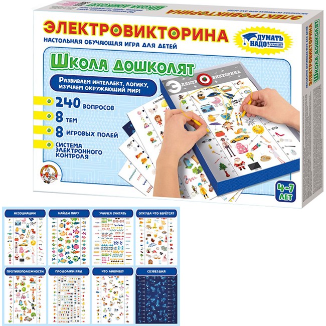 Комплектация: игровые поля - 8 штук; электронная система для самопроверки; правила игры.Тип батареек: 3 х 1,5 V типа ААА (в комплект не входят)