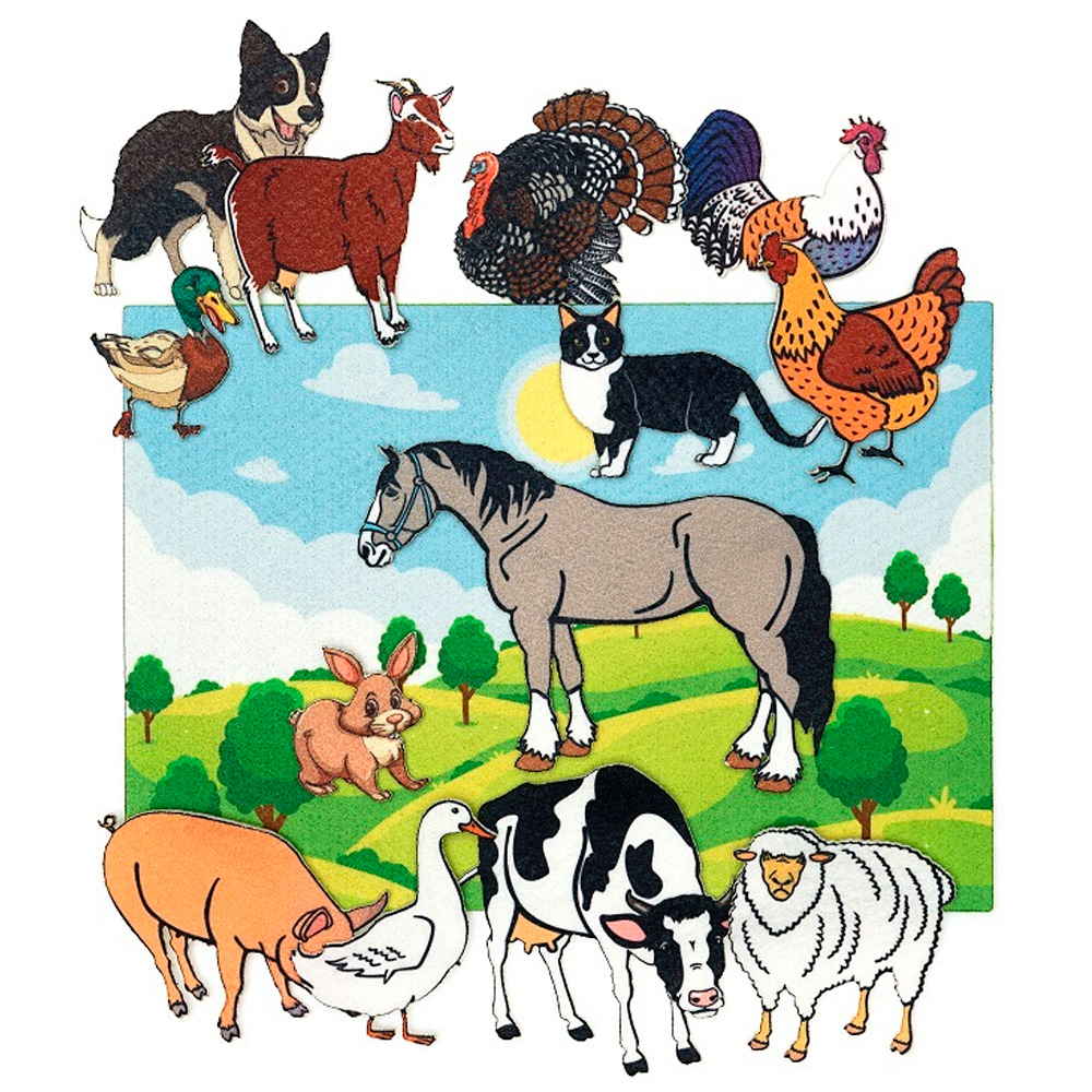 Комплектация: пальчиковые куклы в виде домашних животных – 13 шт., игровое поле (20 х 30 см) – 1 шт.