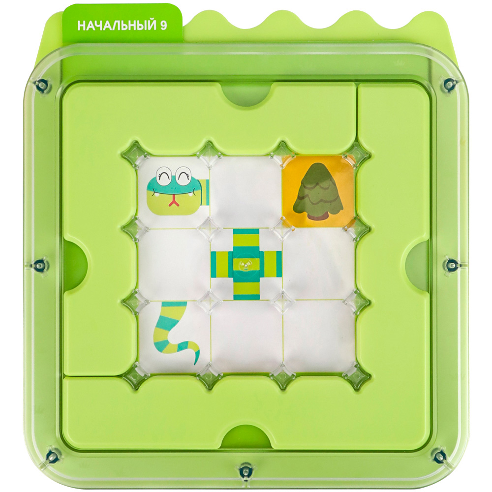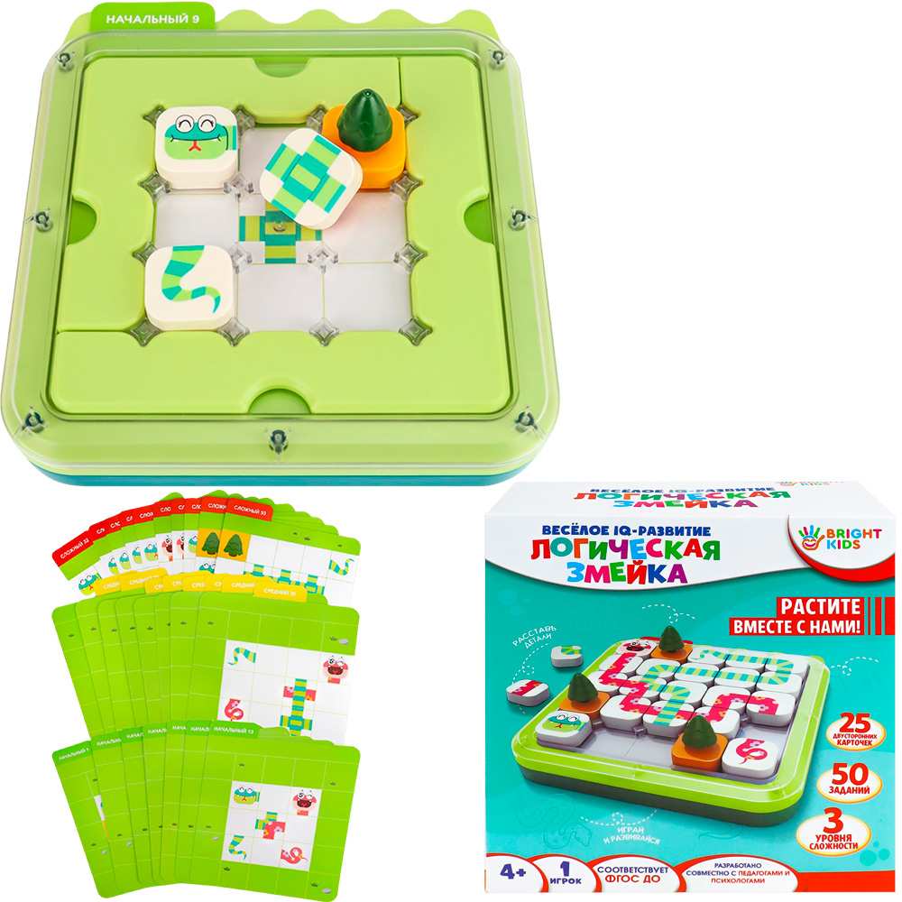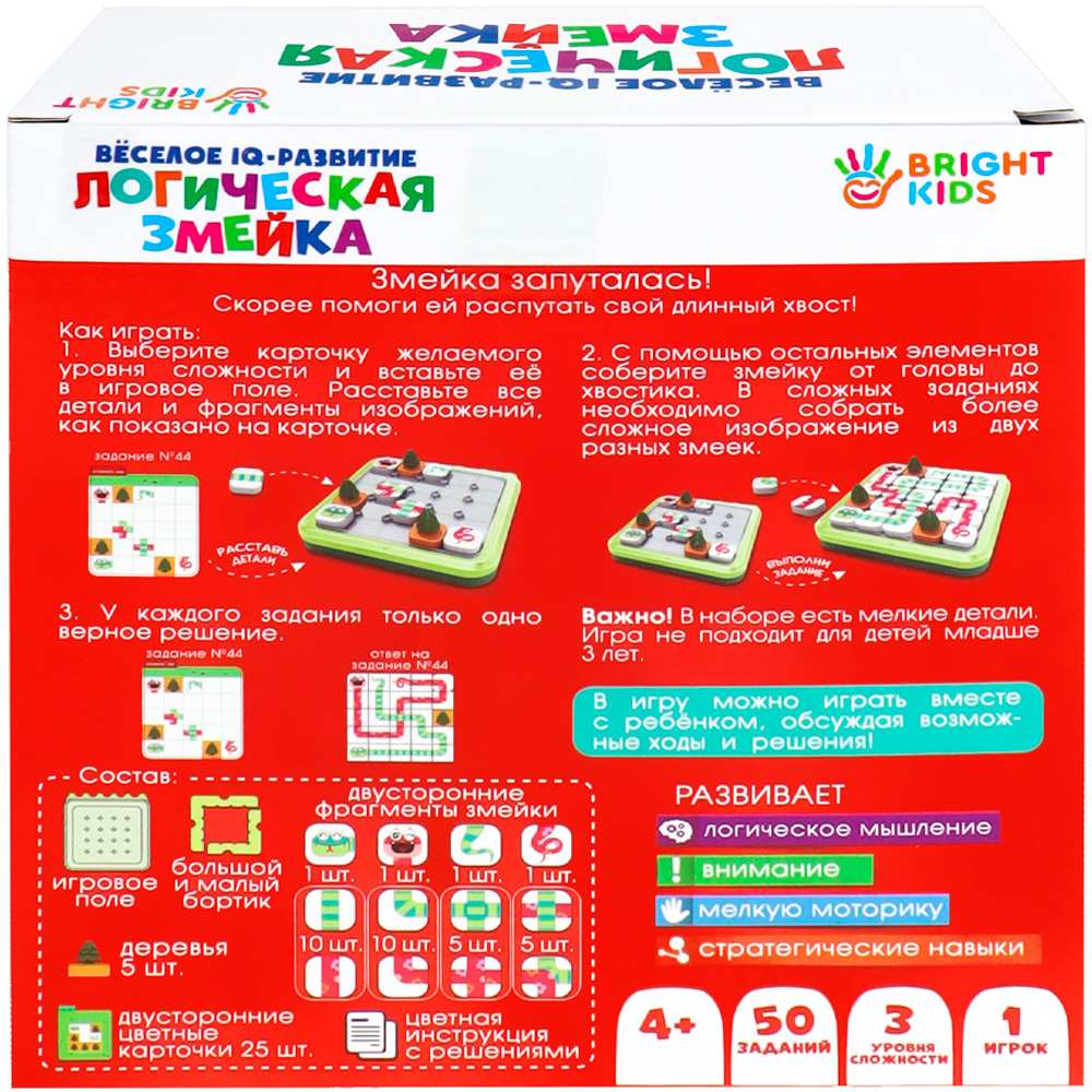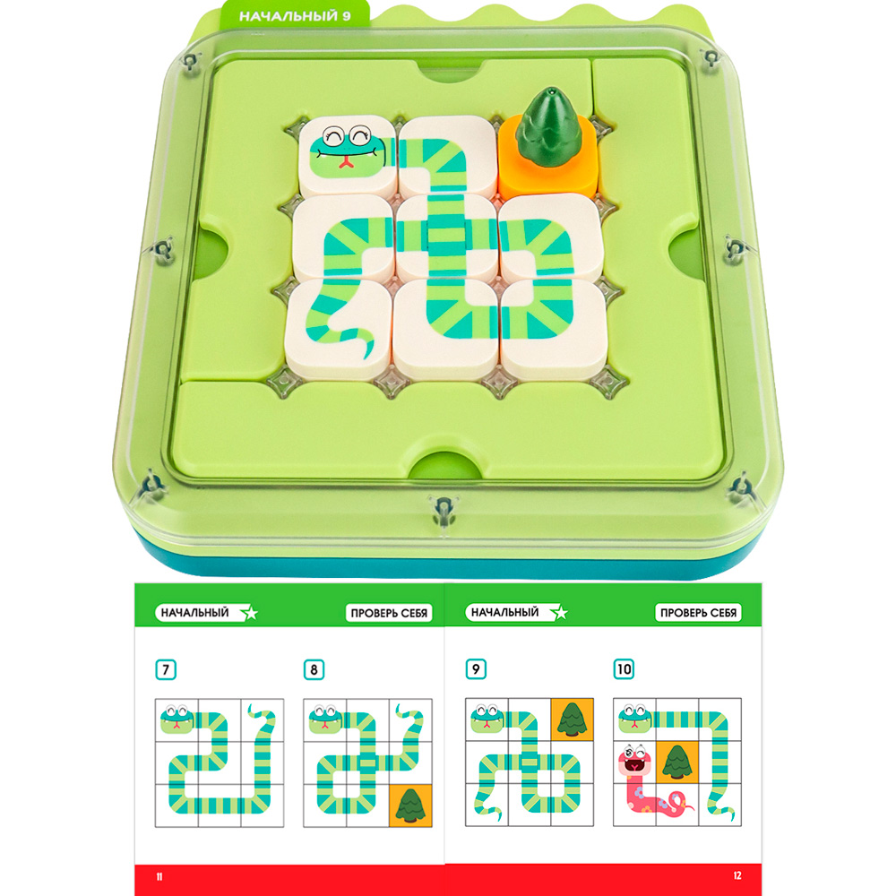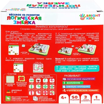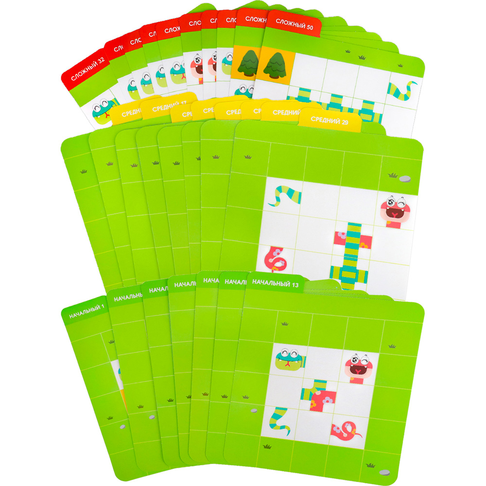 Комплектация: игровое поле - 1 шт., бортики для поля - 2 шт., деревья - 5 шт., двухсторонние элементы змейки - 34 шт., двухсторонние карточки - 25 шт., цветная инструкция с решениями