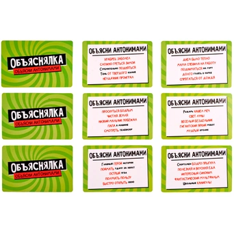 Суть игры: по очереди тяните карту и объясняйте фразы. У вас есть 1 минута, чтобы произнести фразы, заменяя выделенные красным цветом слова на противоположные по значению.