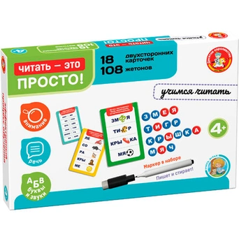 Комплектация: двухсторонние карточки - 18 шт., жетоны - 108 шт., маркер - 1 шт.