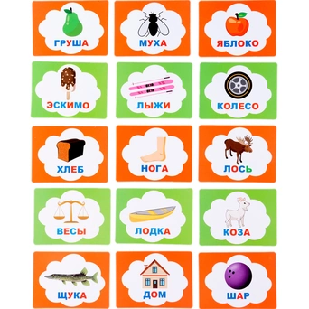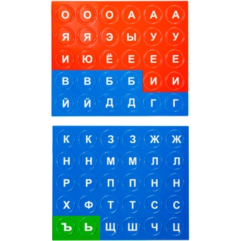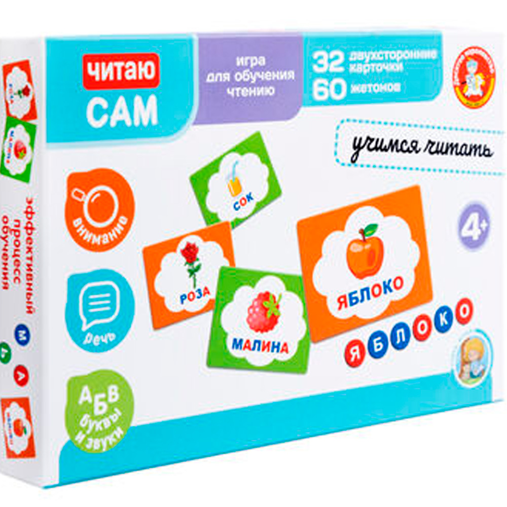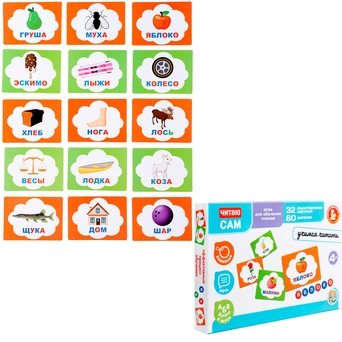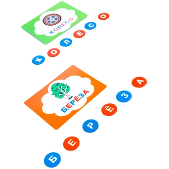 Комплектация: двухсторонние карточки из картона - 32 шт., картонные жетоны с буквами - 60 шт.