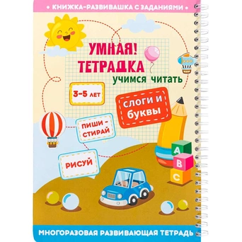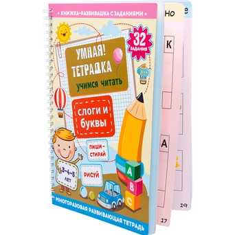 Развивающая рабочая тетрадь с заданиями состоит из страниц со специальным защитным покрытием, обеспечивающим многоразовое использование.