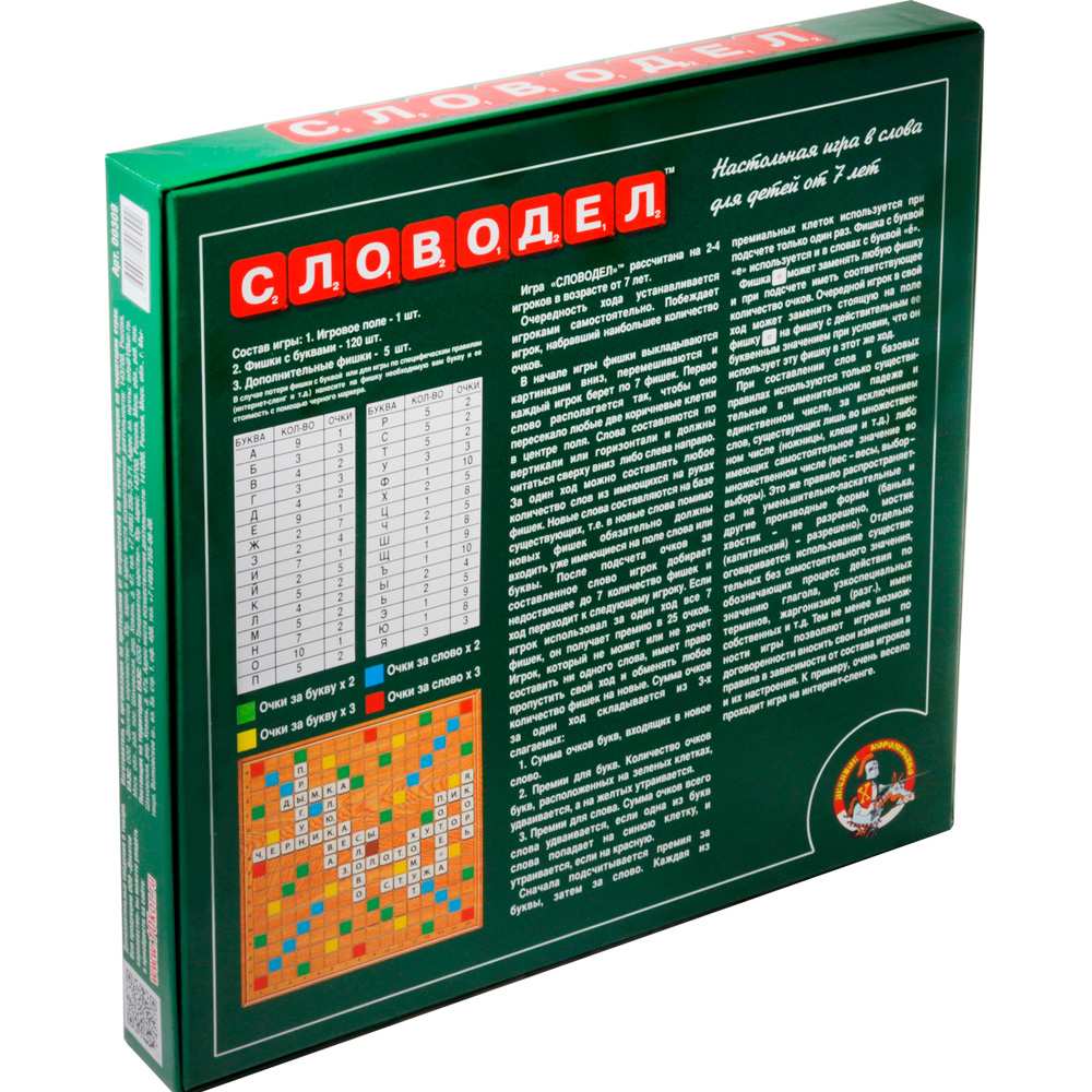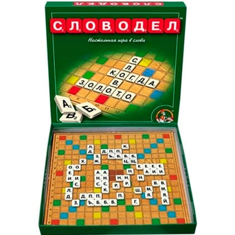 Настольная игра "Словодел" - прекрасная игра для веселого досуга в кругу семьи. В начале игры фишки выкладываются картинками вниз, перемешиваются и каждый игрок берет по семь фишек. Первое слово располагается так, чтобы оно пересекало центральную клетку в центре поля. Слова составляются по вертикали и горизонтали и должны читаться сверху вниз, либо слева направо.За один ход можно составлять любое количество слов из имеющихся на руках фишек. Новые слова составляются на базе существующих. После подсчета очков за составленное слово, игрок добирает недостающее до 7 количество фишек, и ход переходит к следующему игроку. Если игрок использовал за один ход все 7 фишек, то он получает премию в 25 очков. Игрок, который не может или не хочет составить ни одного слова, имеет право пр