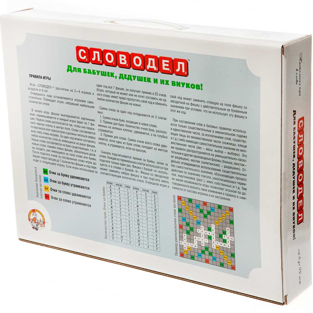 Настольная игра "Словодел") - отличный способ приятно провести время, а заодно расширить свой словарный запас. Цель игроков - создание кроссворда из слов таким образом, чтобы набрать наибольшее количество очков. Игроки по очереди выкладывают игровые фишки с буквами на поле, составляя слова. Тот из них, кто набрал больше всего очков, побеждает в игре. В игре могут принимать участие от 2 до 4 игроков в возрасте от 6 лет.
