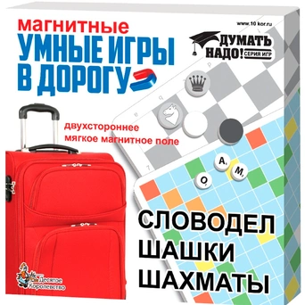 Размер упаковки- 24*24*2 смПеред вами игра, где магнитные фишки и элементы фиксируются не на экране из жести, а на мягком поле, обклеенным с двух сторон тонким картоном: с одной стороны - поле предназначено для игры в шахматы и шашки, а с другой - для игры в Словодел. Фишки к игре изготовлены из мягкого безопасного полимерного материала с магнитным основанием для крепления.